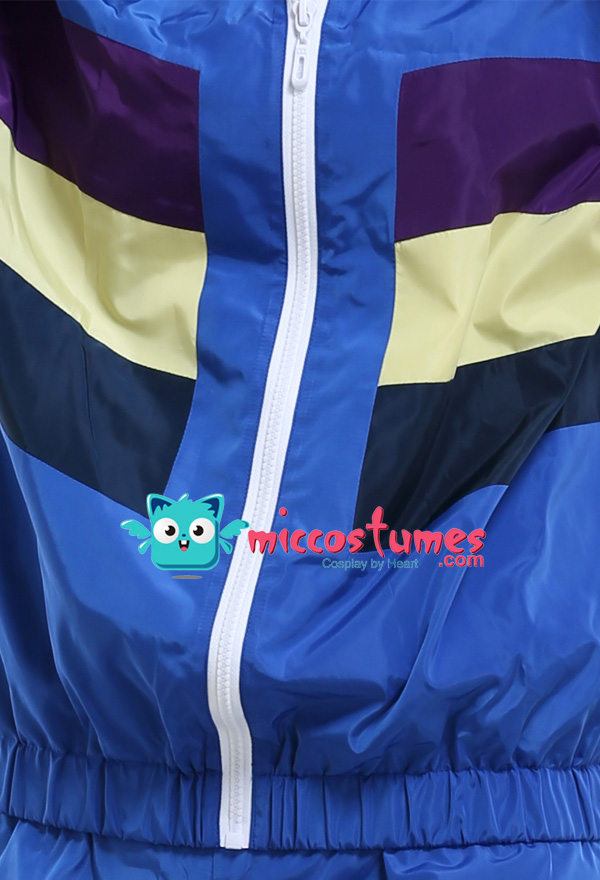 Costume Includes: jacket, pants. Materials: Oxford cloth, lining Design Details: The costume belongs to casual style, which fits all body shapes. Elastics are used in the cuffs, hem and waist. The fabric is selected with features of comfort, waterproof and crease proof. From the color matches to style, the costume is an 80s retro.