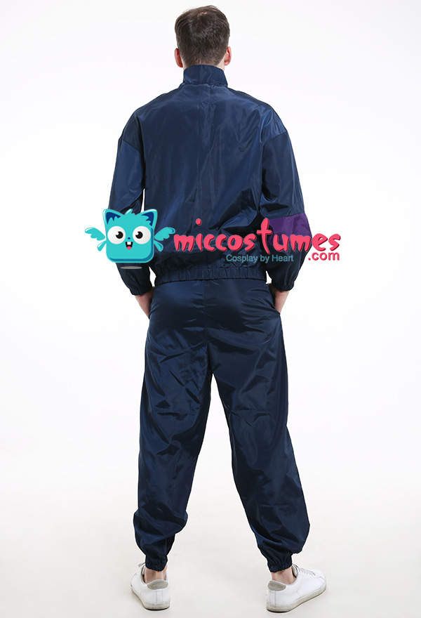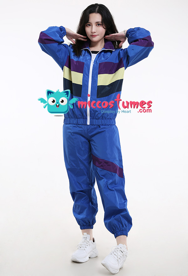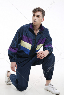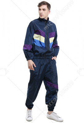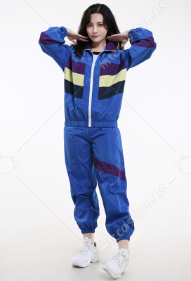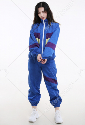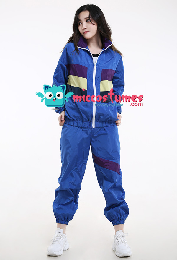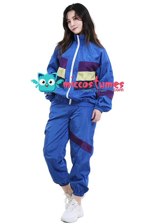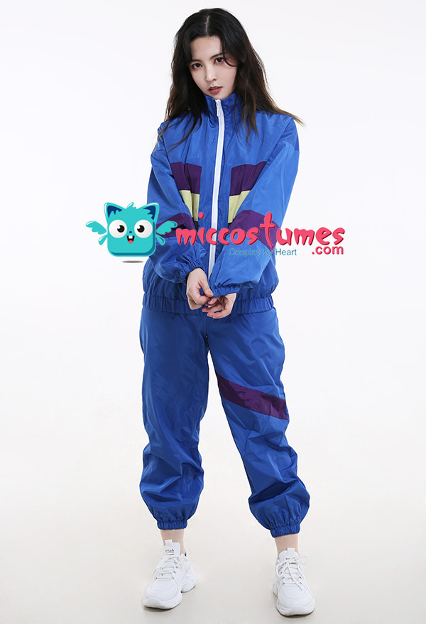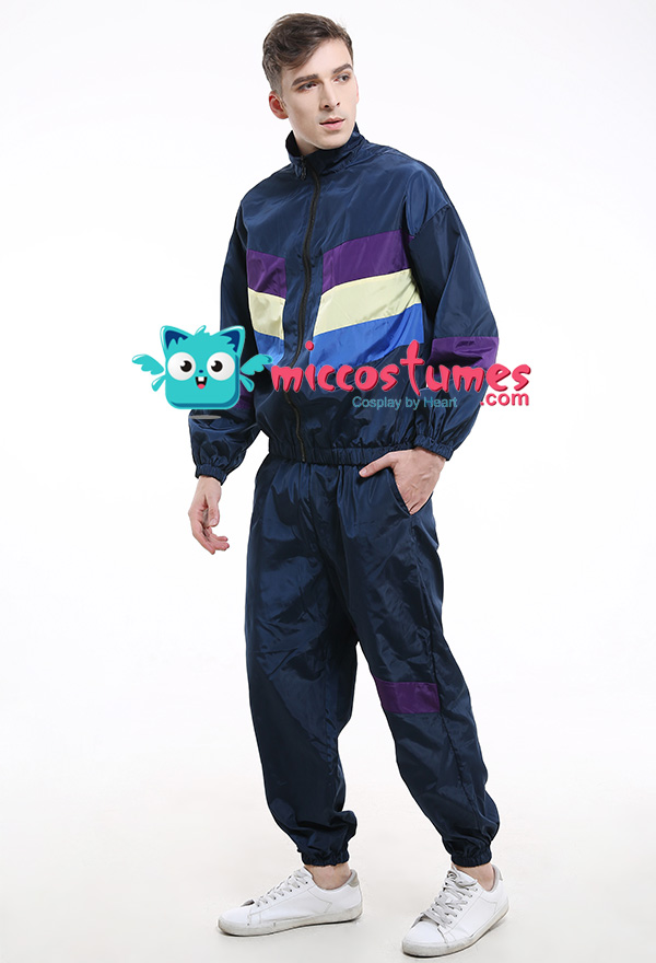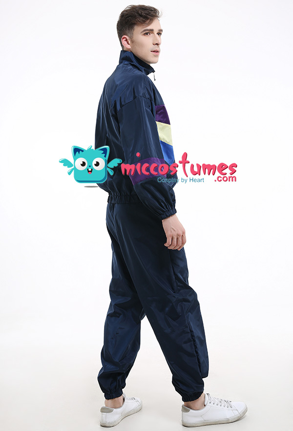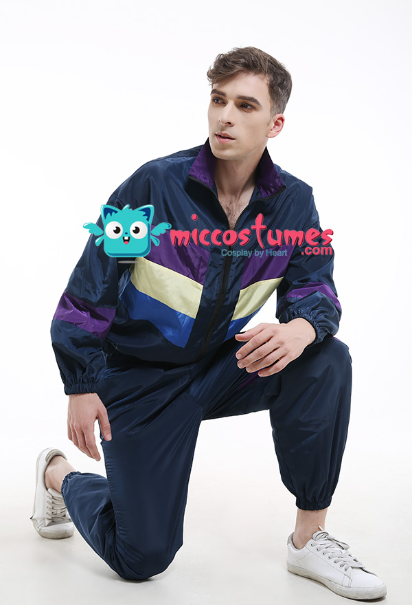 Costume Includes: jacket, pants. Materials: Oxford cloth, lining Design Details: The costume belongs to casual style, which fits all body shapes. Elastics are used in the cuffs, hem and waist. The fabric is selected with features of comfort, waterproof and crease proof. From the color matches to style, the costume is an 80s retro.