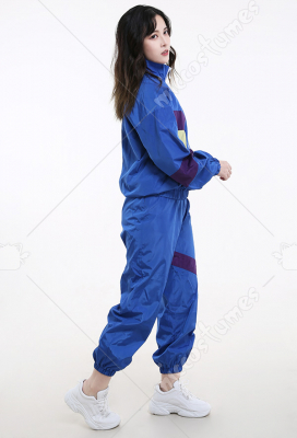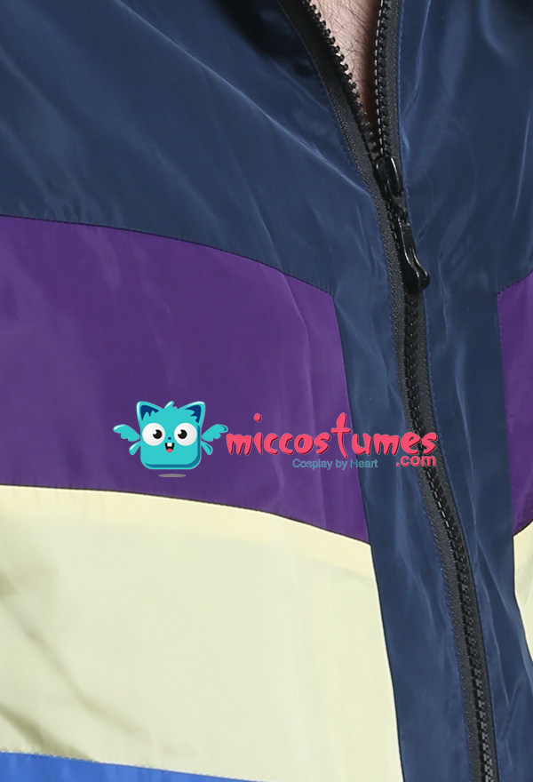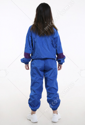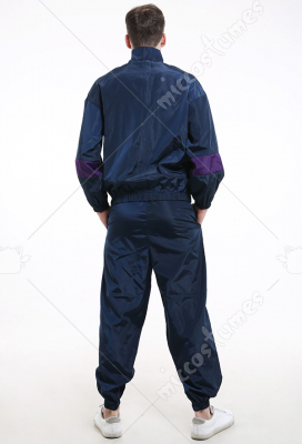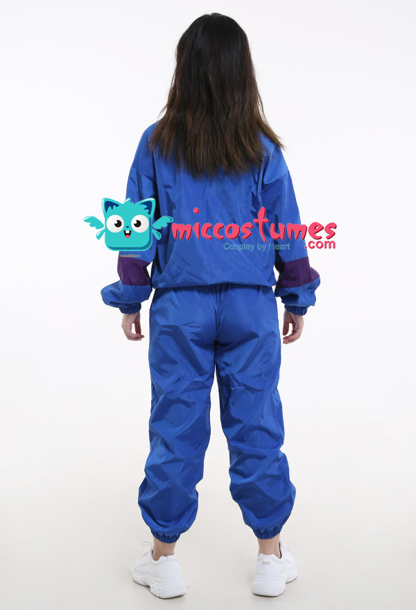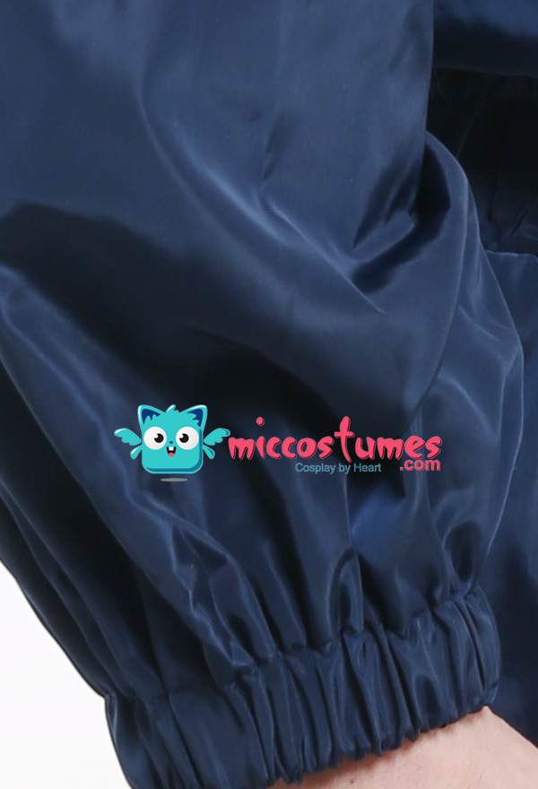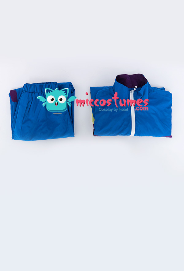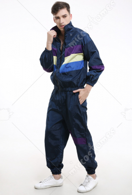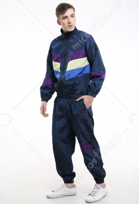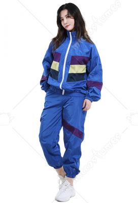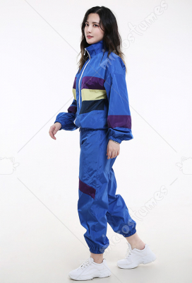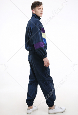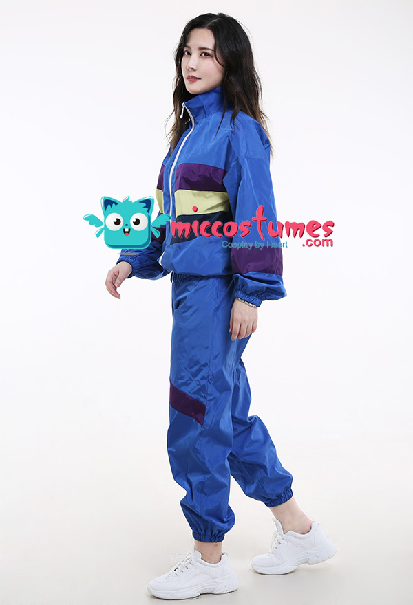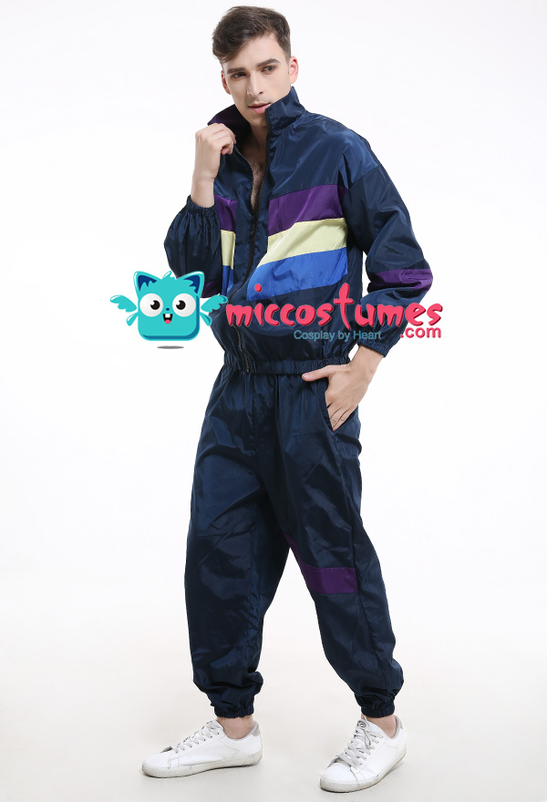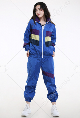 Costume Includes: jacket, pants. Materials: Oxford cloth, lining Design Details: The costume belongs to casual style, which fits all body shapes. Elastics are used in the cuffs, hem and waist. The fabric is selected with features of comfort, waterproof and crease proof. From the color matches to style, the costume is an 80s retro.