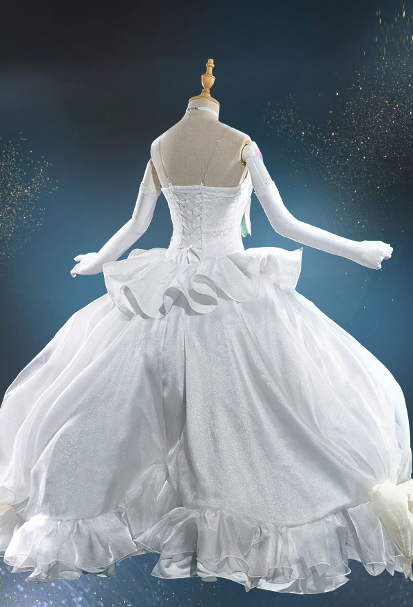 The costume includes gown, chest bowknot, headdress, veil, leg accessory*2, stockings, glove*2, petticoat, clips, invisible bra straps, necklace, adjust plug, metal circle, ribbon. It is made of satin, gauze.