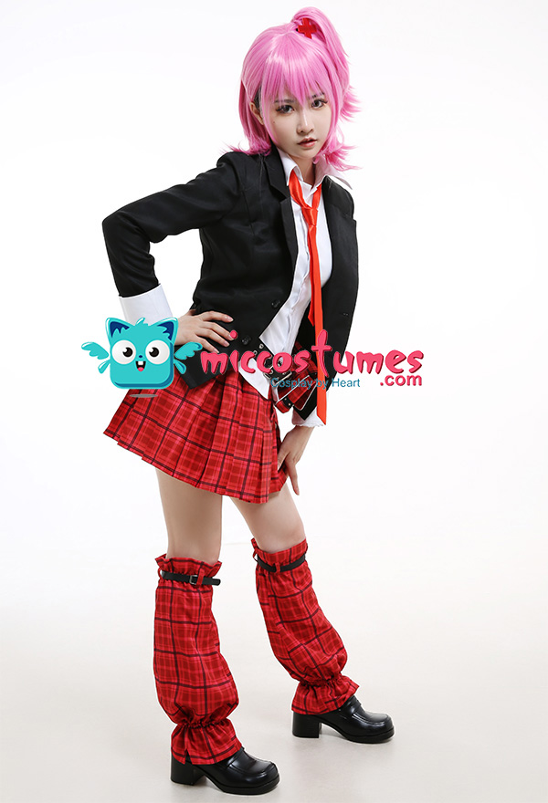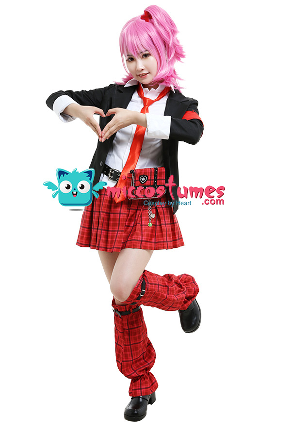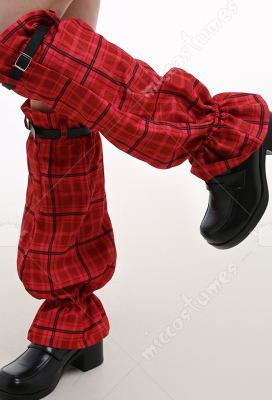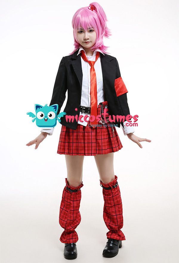 Costume Includes: coat, shirt, belt, waist bag, skirt, leg covers*2, leg belts*2, armband, tie, headdresses*2. Material: uniform cloth, polyester, satin. Design Details: The coat is made of uniform cloth, and the shirt adopts polyester as the material. The skirt and leg covers are both digitally printed. The waist bag is decorated with ruffles and rivet belts. Besides, the tie and belt are all included.