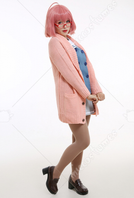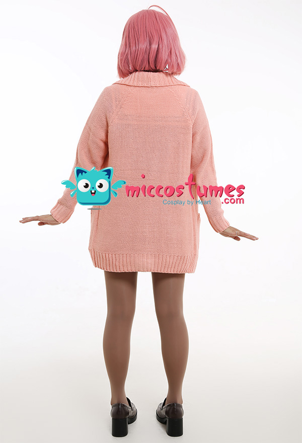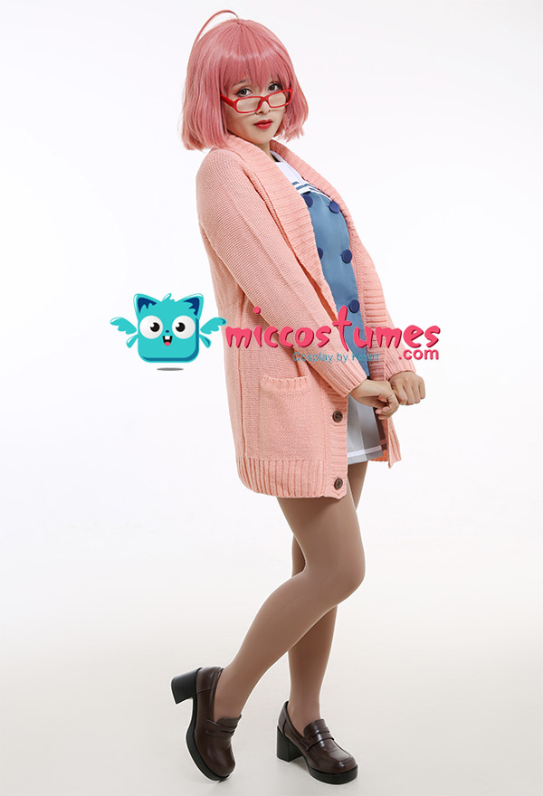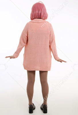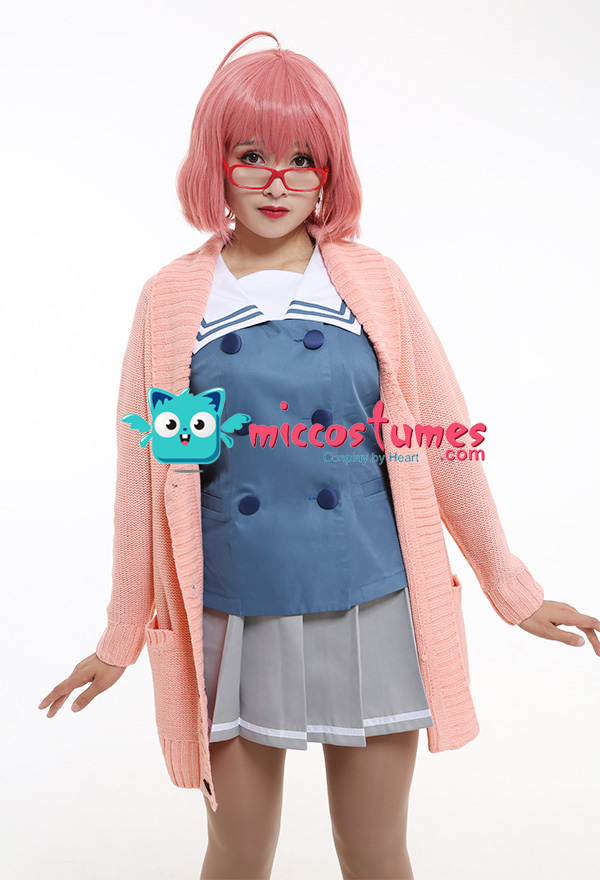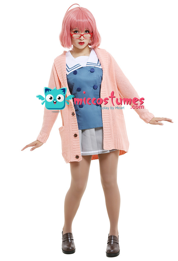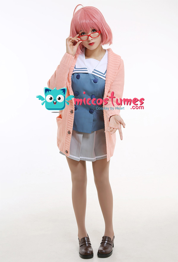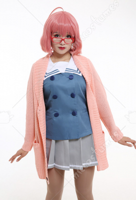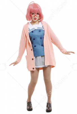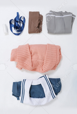 Costume Includes: sailor collar top, skirt, sweater uniform coat, pantyhose. Material: uniform cloth, polyester. Design Details: The sailor collar top and skirt are both made of polyester. The sweater coat designs identically with the role in anime, and the brown pantyhose is also paired.