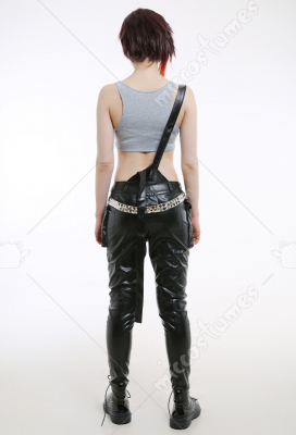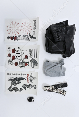 Costume Includes: vest, overalls, hair clip, belt, tattoo stickers. Material: knitting cloth, lining cloth, soft leather fabric, tattoo fabric. Design Details: The overalls is with adjustable straps on the shoulder and a zipper on the side. The side pocket is with velcro design for opening or closing. The twisted part of the vest at waist can be tied by yourself. The whole set of tattoos are inclued in the outfits.