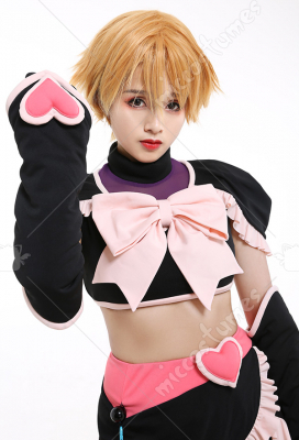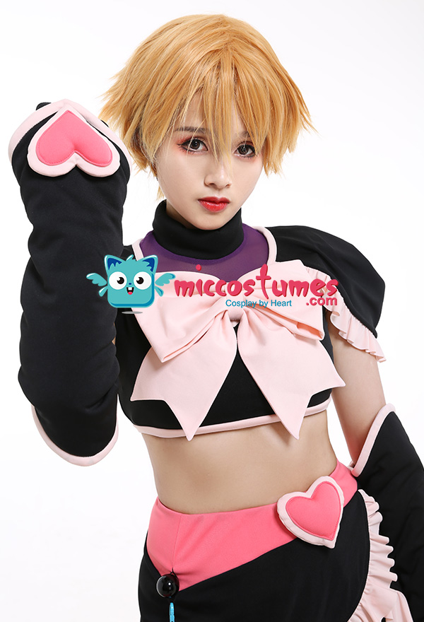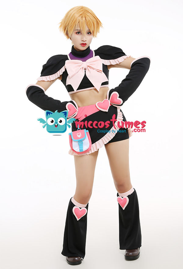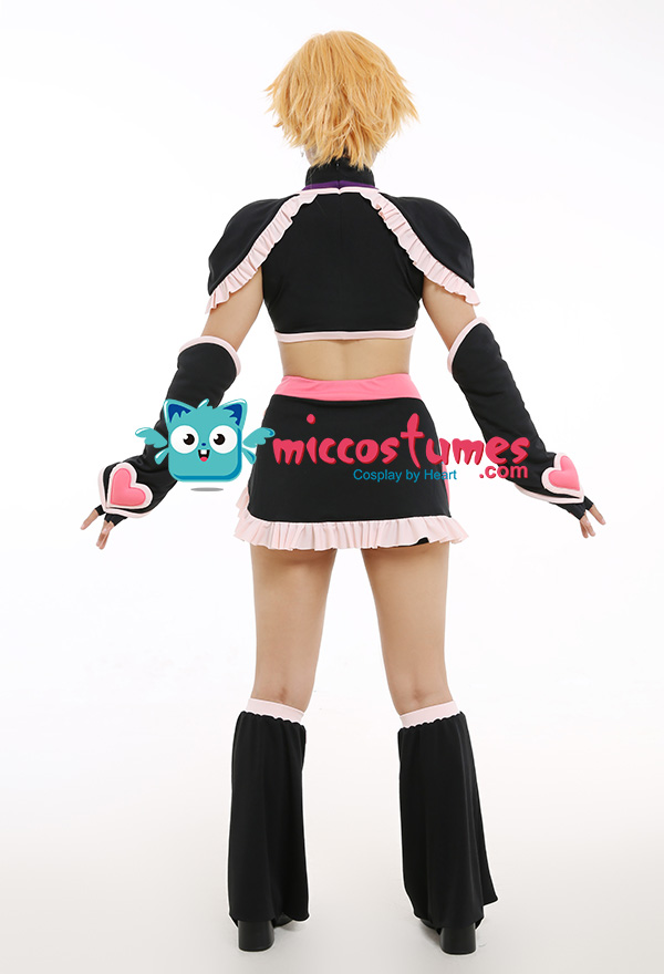 Costume Includes: top, skirt, leg covers*2, arm covers*2, gloves*2, safety shorts, waist bag. Material: pu leather, cotton, knitting cloth, elastic net. Design Details: The outfits adopts spliced color-contrast elastic fabric, which pairs with wiast bag. The zipper is on the back. And the top is with shoulder pads inside, which looks more dimensional. .jpg)