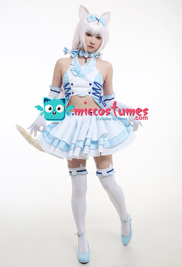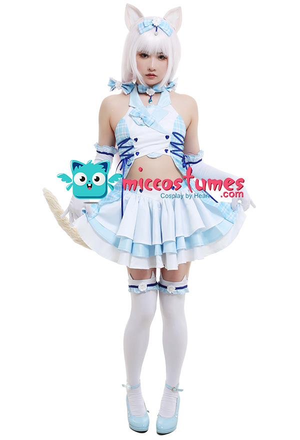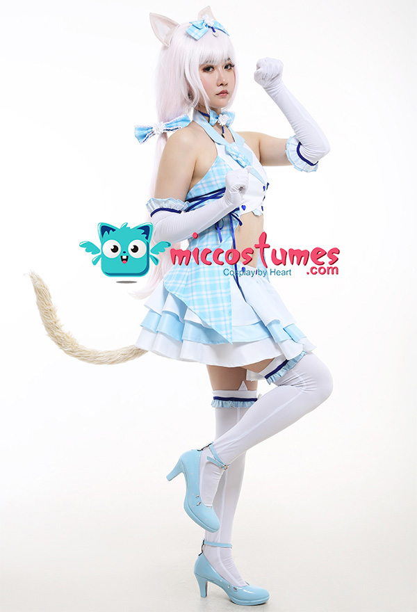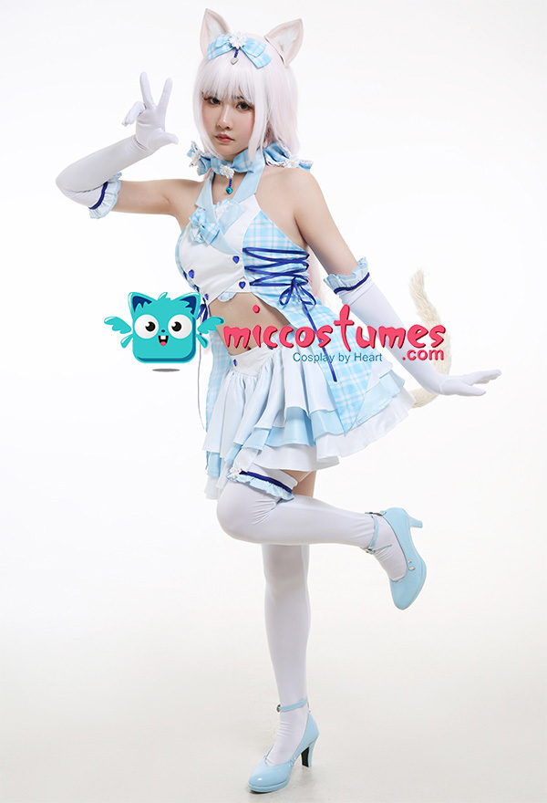 Costume Includes: inner coat, skirt, choker, gloves*2, cat ears*2, headdress bow, hair accessories*2, stockings*2. Material: uniform cloth, chiffon, knitted cloth, velvet, aluminum wire. Design Details: There are clips on the hair accessories, zippers on the tops, straps on the sides of the clothes, elastic waists on the skirts, and the plaid patterns on the skirts are very clear and beautiful.