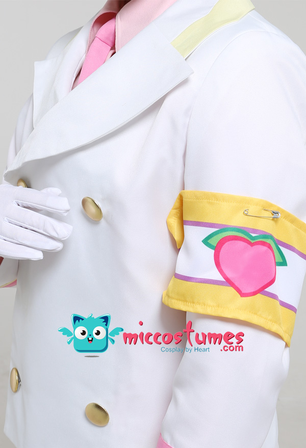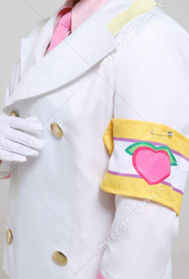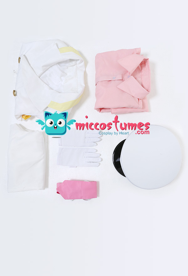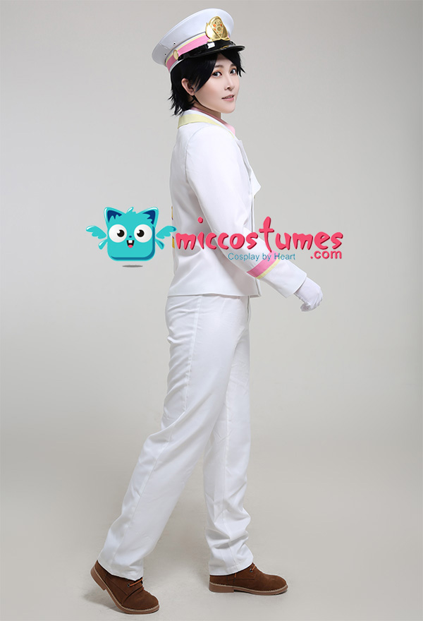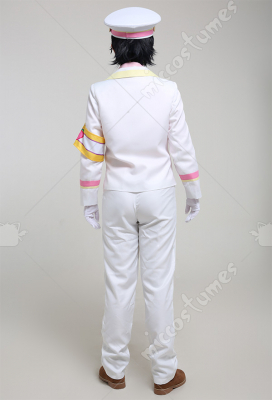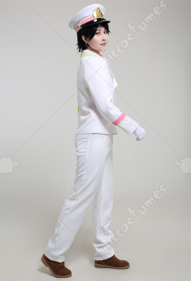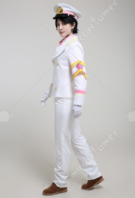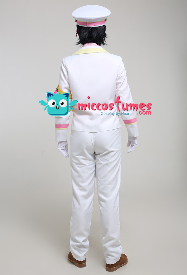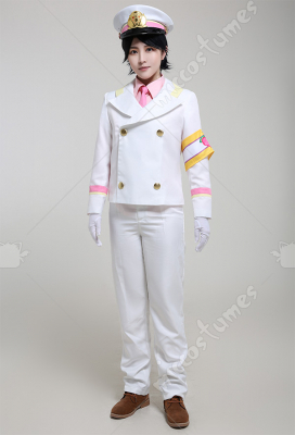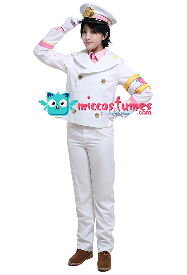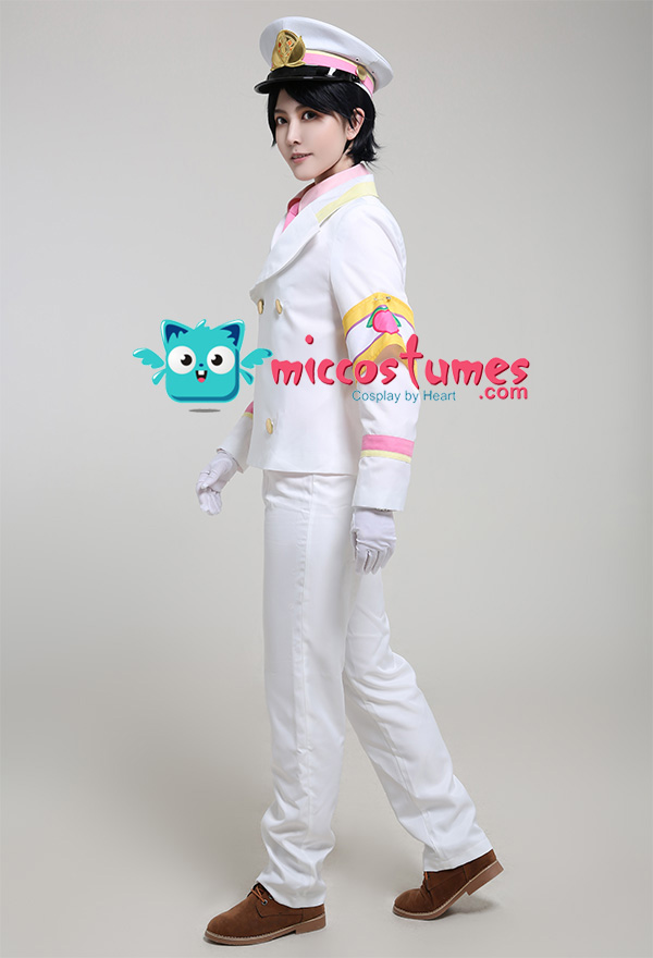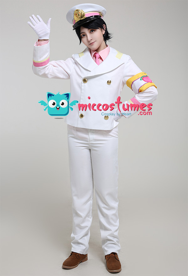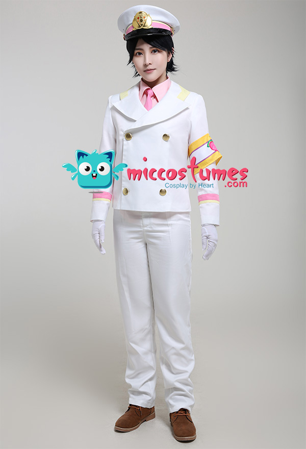 Costume Includes: shirt, pants, uniform jacket, tie, uniform hat, gloves*2. Material: uniform cloth, polyester, lining cloth, golden hard leather. Design Details: The costume is made of uniform cloth and adopts color-contrast design. The costume is paired with peach pattern armband. The uniform hat is printed delicately, and the tie is also included in this outfits.
