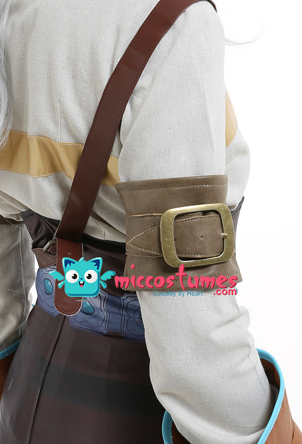 Costume Includes: inner coat, pants, corset, arm guards*2, gloves*2, shoulder strap. Material: pu leather, flax fabric, coated fabric. Design Details: Both the pants and corset are made of elastic printed coated fabric, which looks very delicate. The top splices the comfortable flax fabric with elastic leather. The gloves and arm straps are made of soft leather.