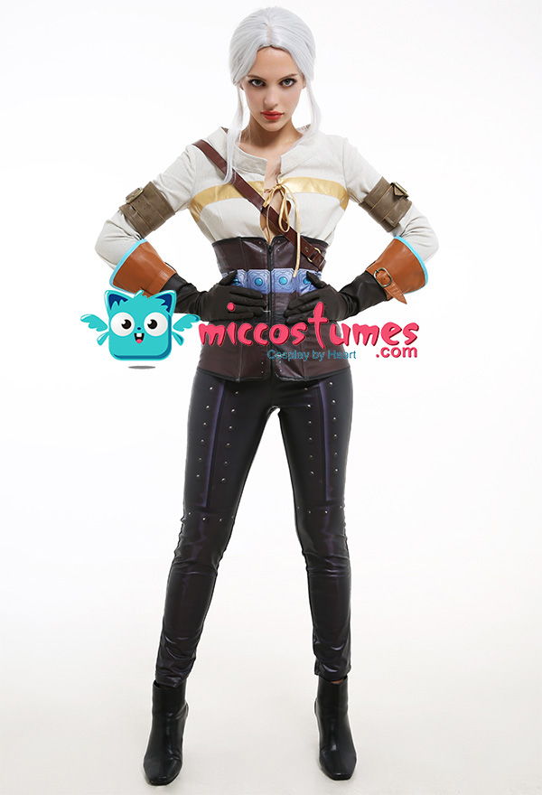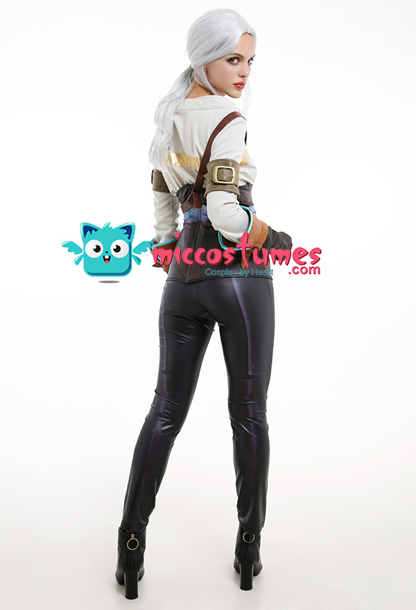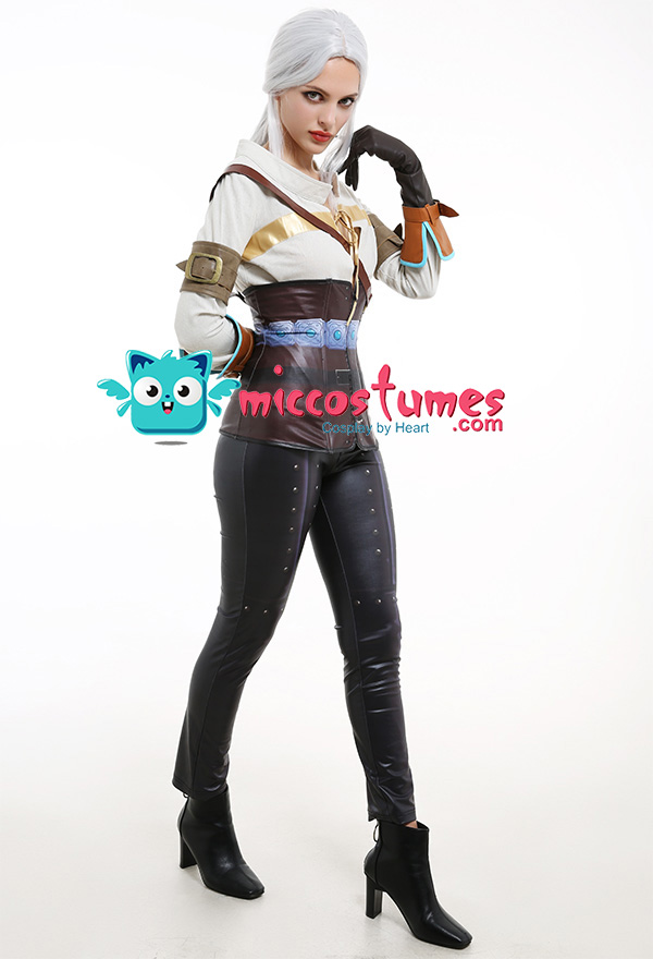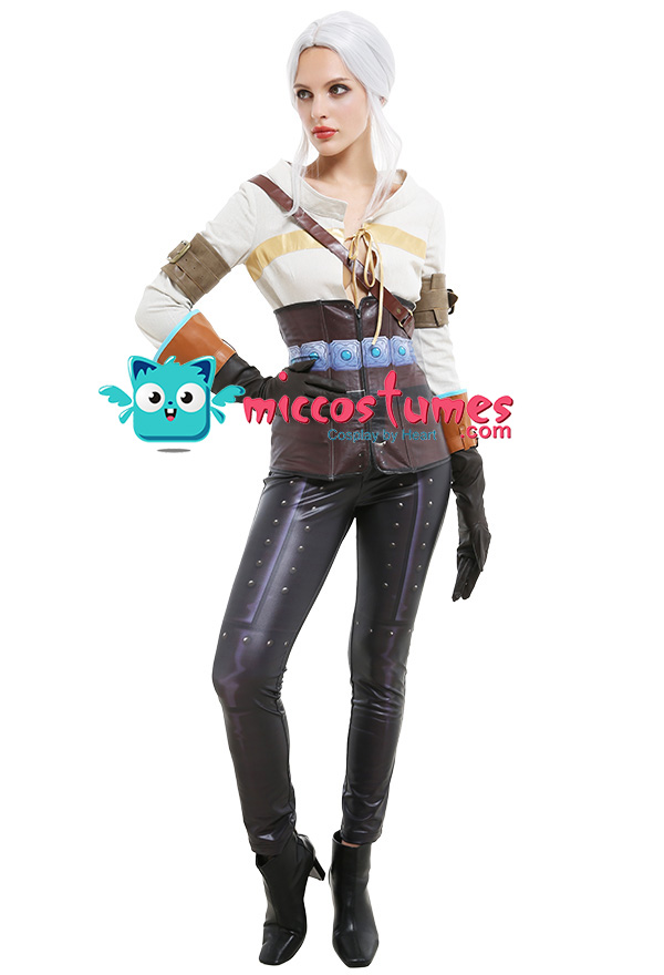 Costume Includes: inner coat, pants, corset, arm guards*2, gloves*2, shoulder strap. Material: pu leather, flax fabric, coated fabric. Design Details: Both the pants and corset are made of elastic printed coated fabric, which looks very delicate. The top splices the comfortable flax fabric with elastic leather. The gloves and arm straps are made of soft leather.