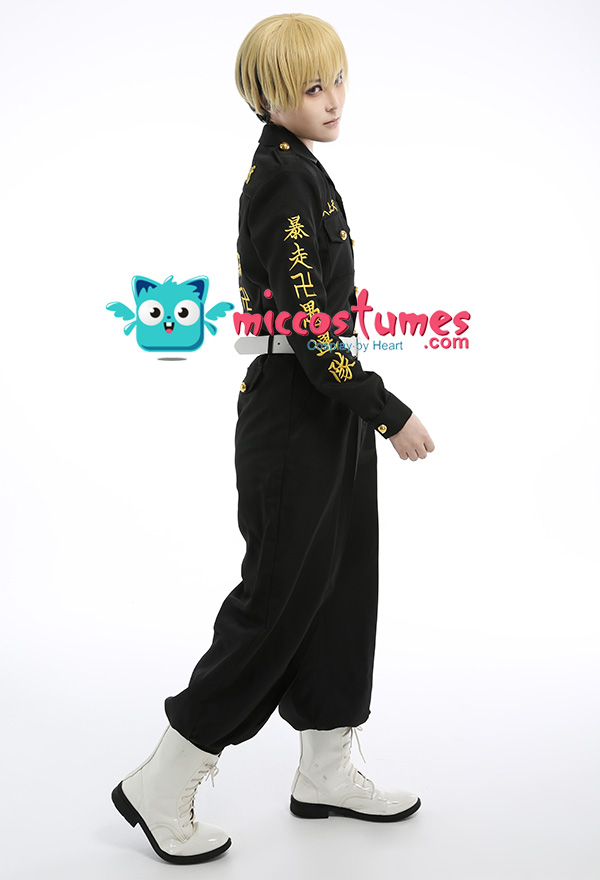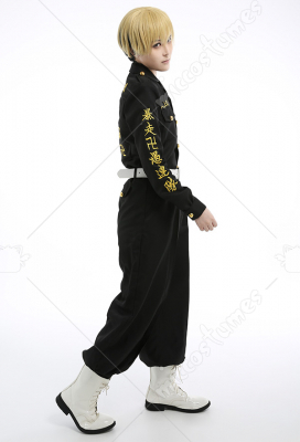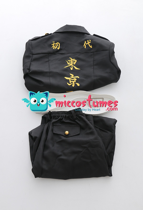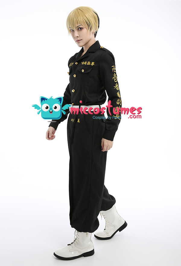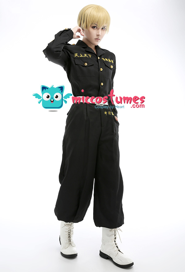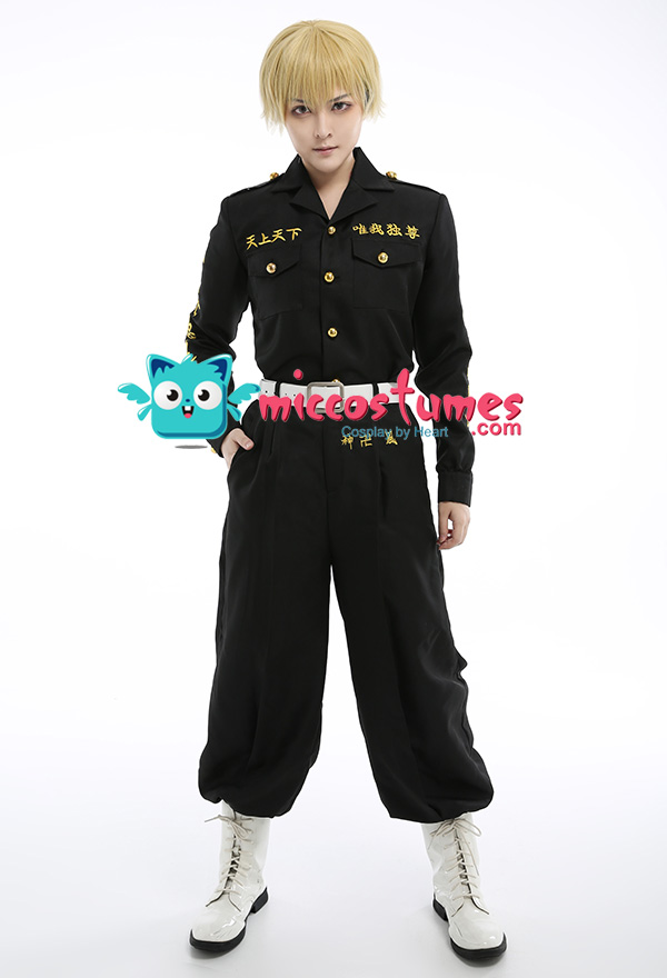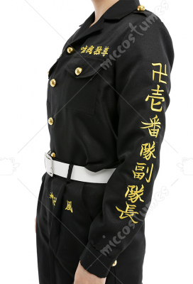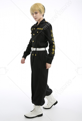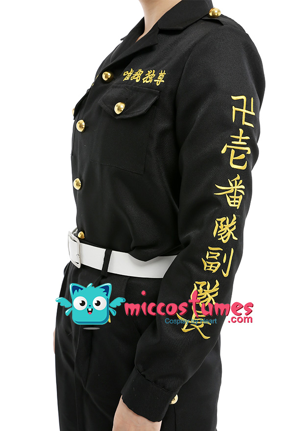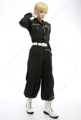 Costume Includes:tops, trousers, belt. Material: uniform cloth. Design Details: The costume is made of uniform cloth and decorated with gold mushroom buckle, the letters on the tops are embroidered. Besides, this suit is accessorized with a belt.