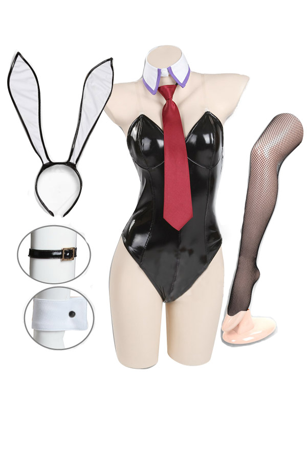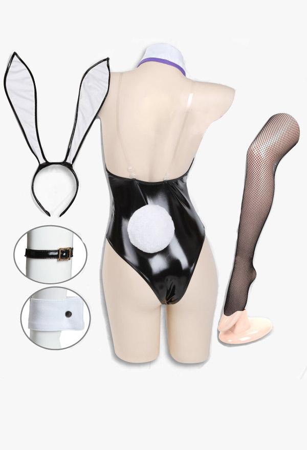 The costume includes tie, rabbit ear headdress, collar, jumpsuit, transparent shoulder strap, stockings, bracelet *2, armband *2. It is made of patent leather.