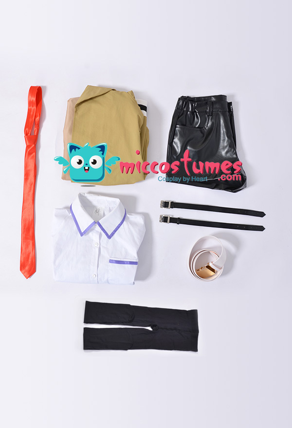 The costume includes coat, shirt, arm strap*2, tie, belt, shorts, stockings. It is made of PU leather, shirt fabric, lining, nylon.
