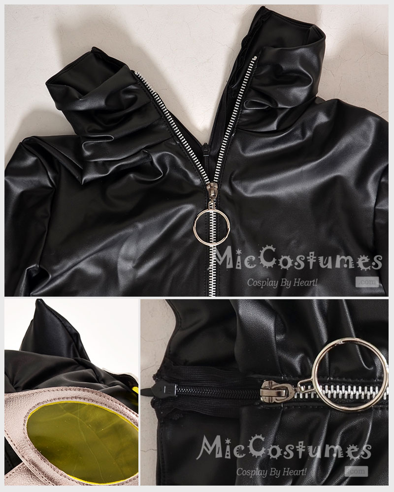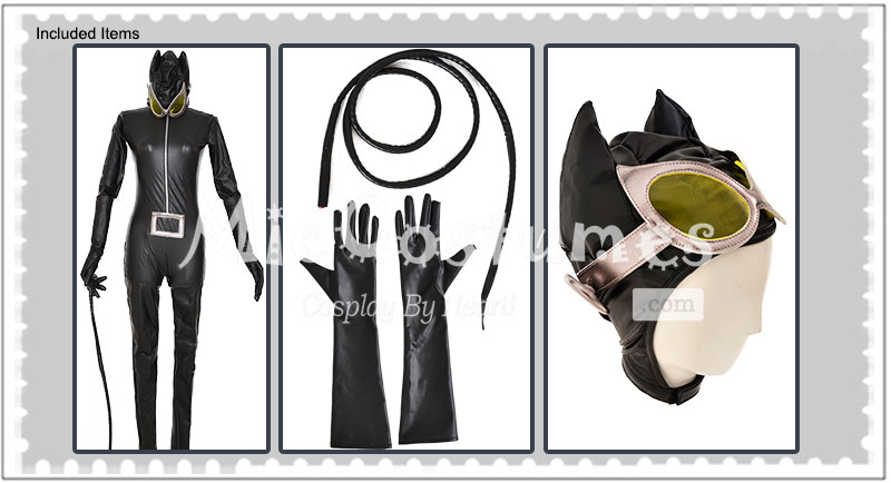 This costume includes jumpsuit, headcover, whip, gloves×2. It is made of PU leather.