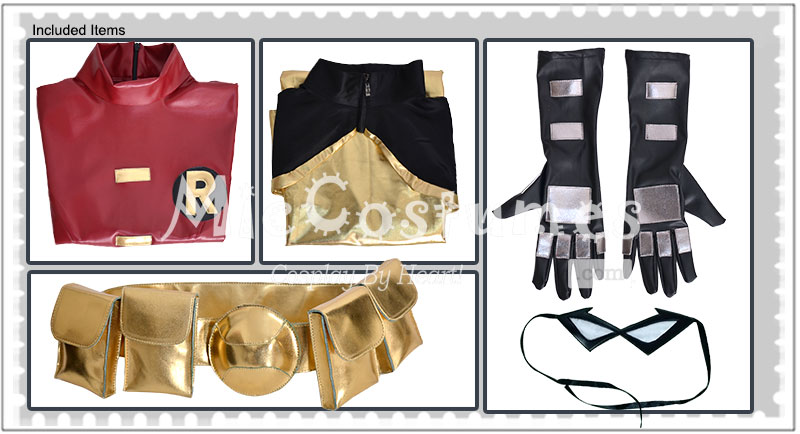 The costume includes upper garment, pants, cloak, belt, four waist bags, two gloves and eye patch. The costume is made of PU leather, satin, spandex and knitted fabric.