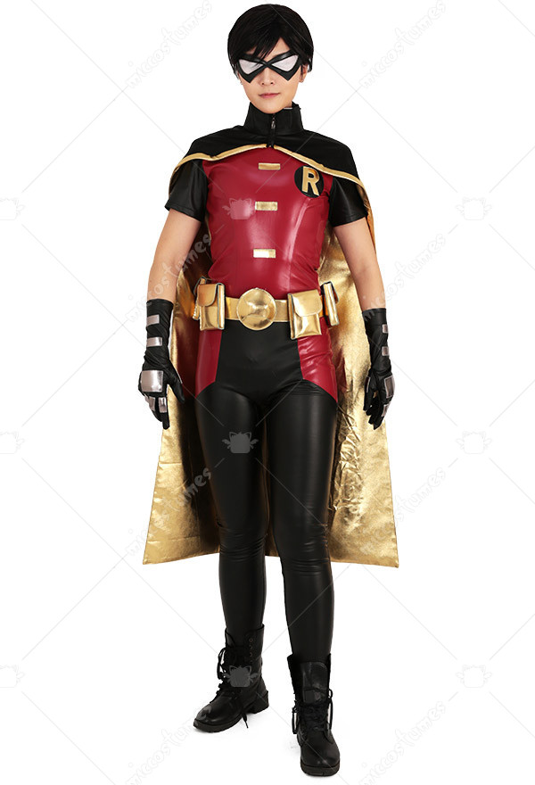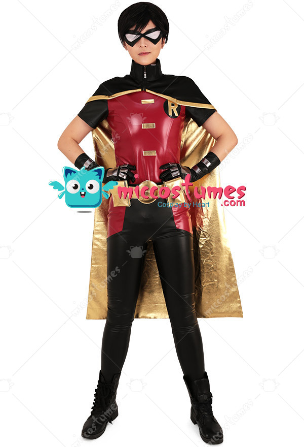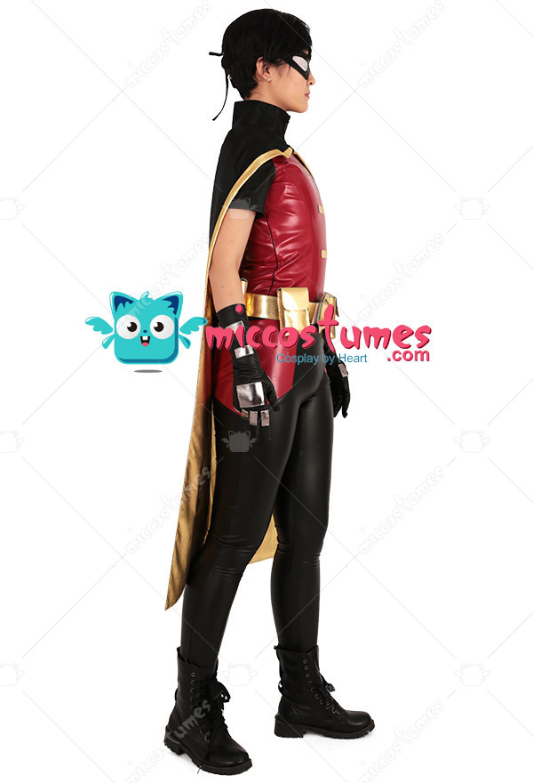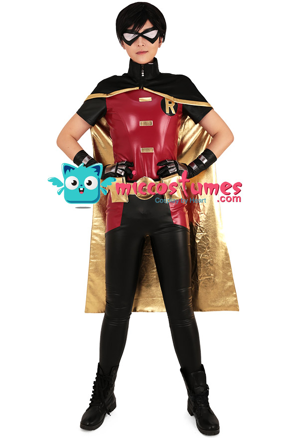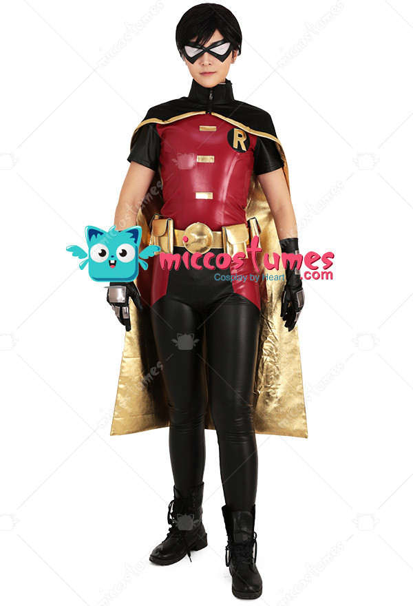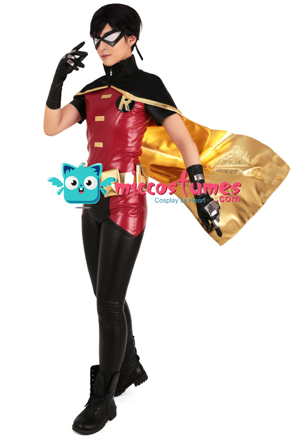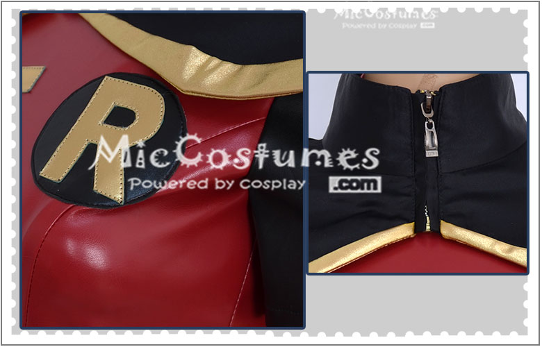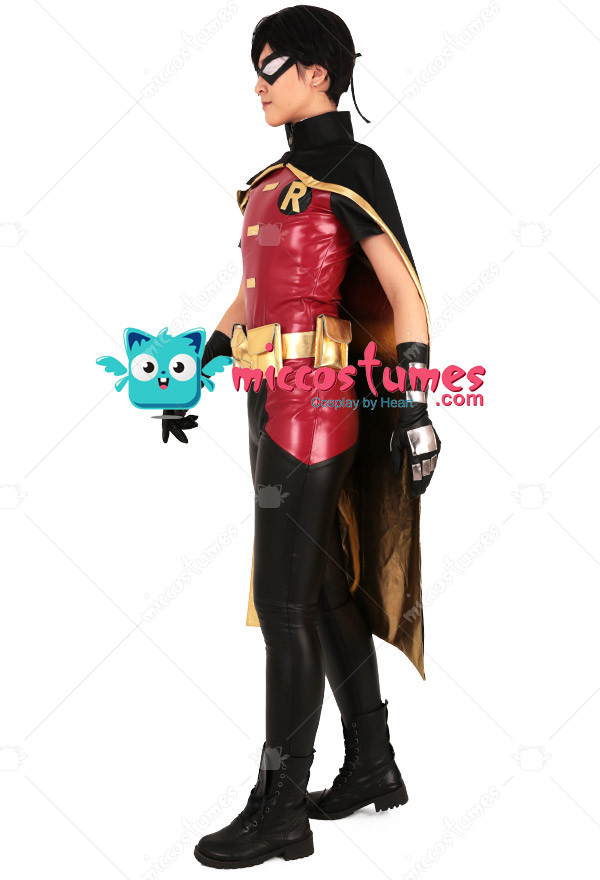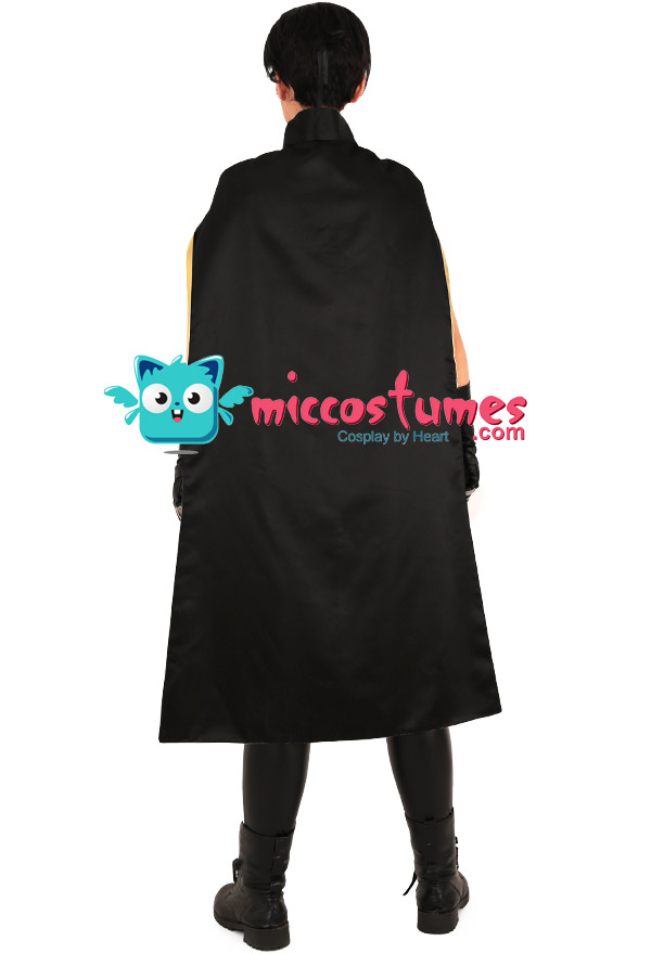 The costume includes upper garment, pants, cloak, belt, four waist bags, two gloves and eye patch. The costume is made of PU leather, satin, spandex and knitted fabric.