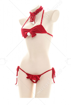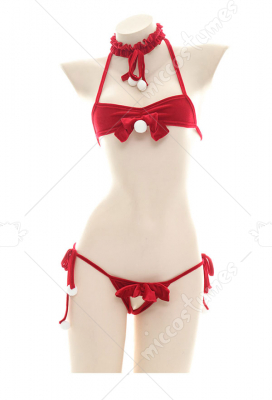 The costume includes bikini top, briefs, garters. It is made of imitated silk fabric.