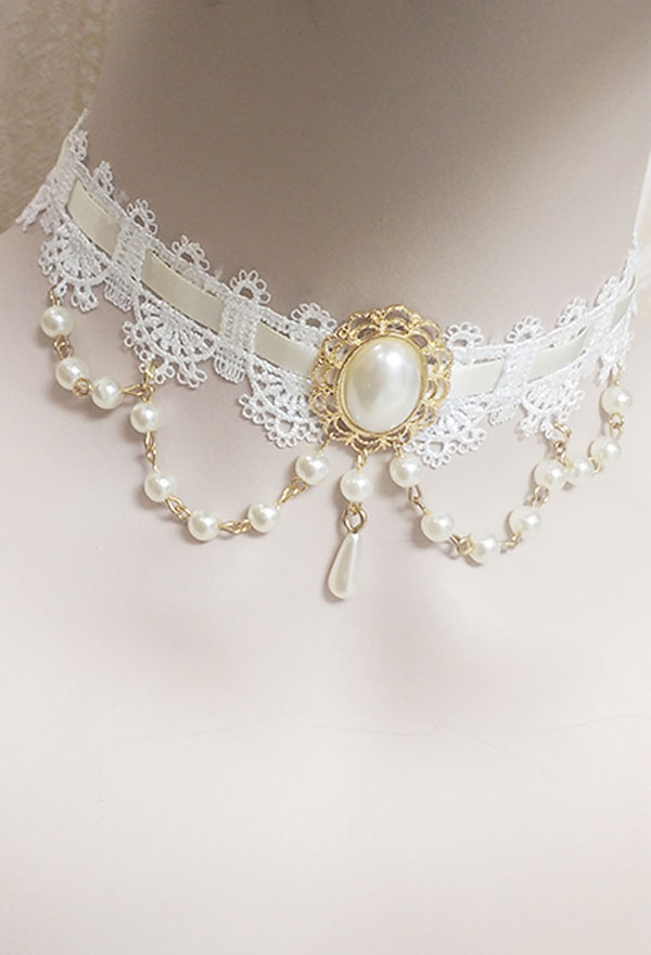 Sweet Lolita Accessory Lace Ribbon Imitation Pearl Cluster Gem Choker Necklace Bridal Jewelry White Beads Pendant Neck Accessory