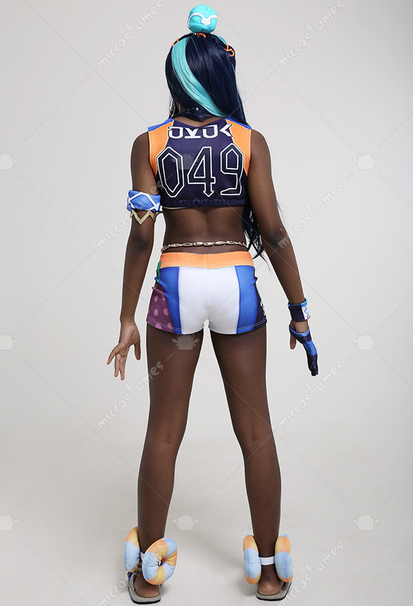 The costume includes top, shorts, shoe accessory*2, waist chain, necklace, wrist band, arm band and glove*1, head accessory ball, earring*2 and hair elastic*6.It is made of spandex, PU leather and cotton.