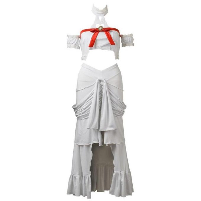 ・A white satin top with red bow on the front