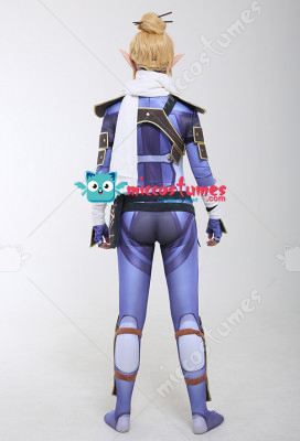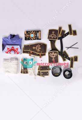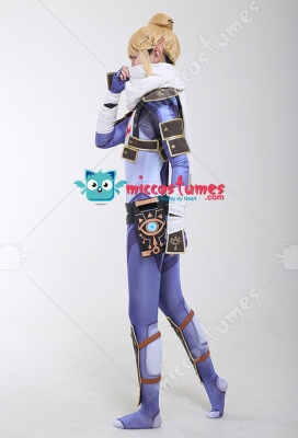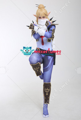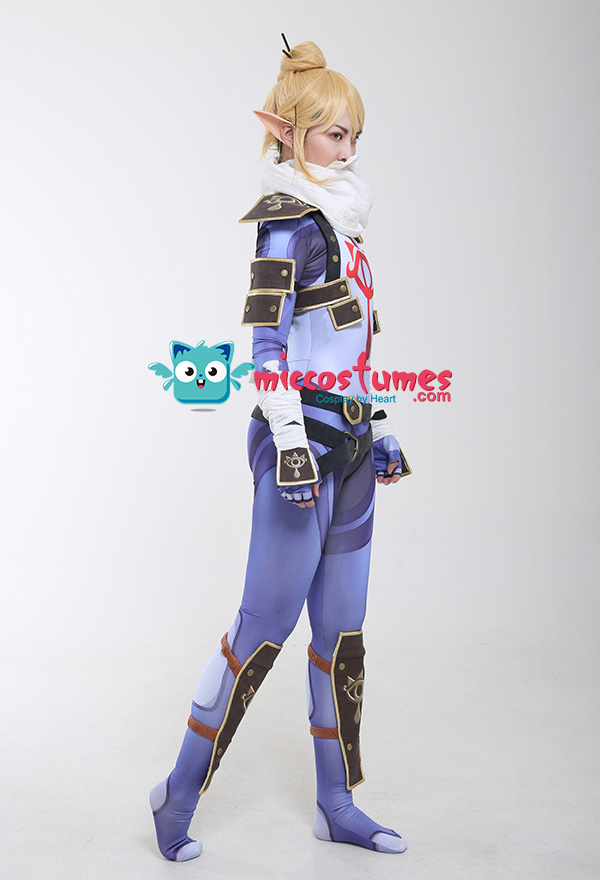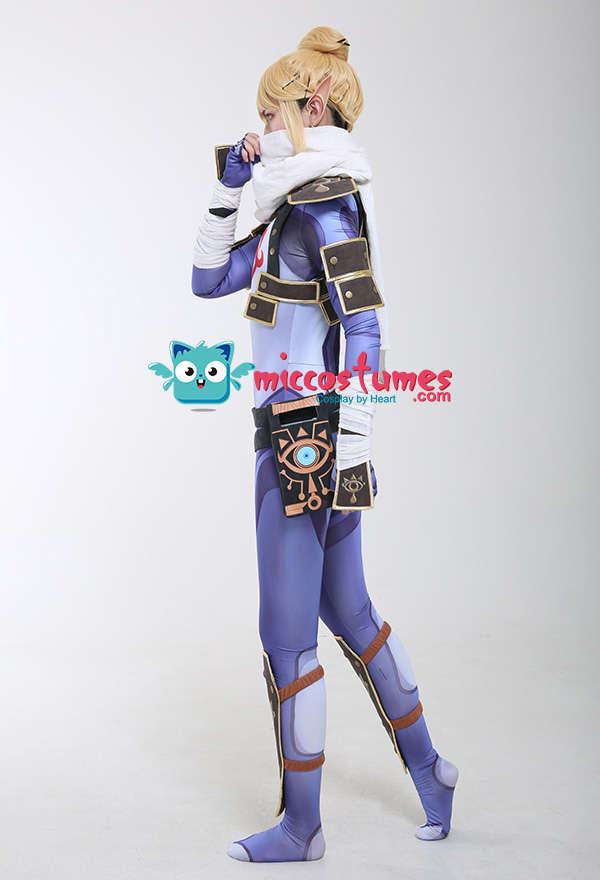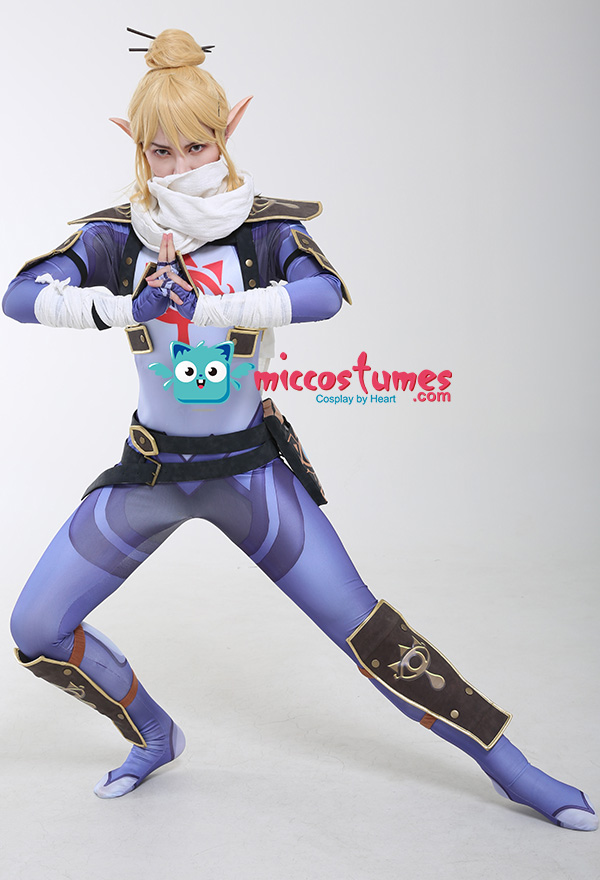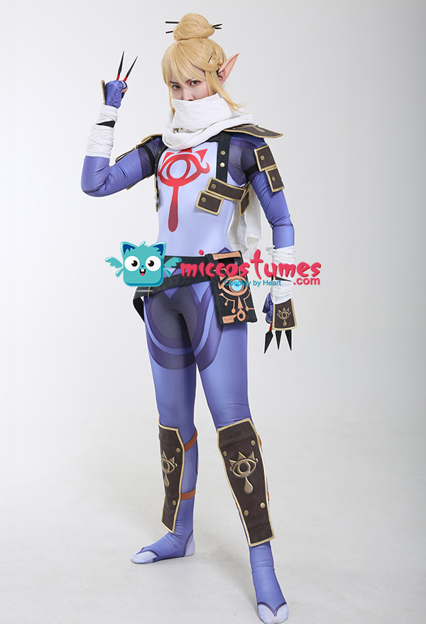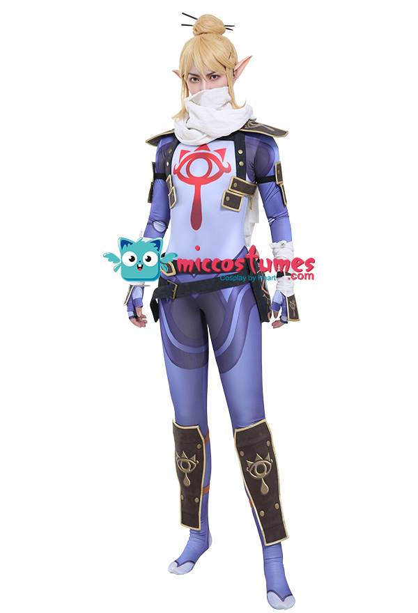 The costume includes jumpsuit, armours set*1, handguard*2, leg guards*2, armguards*2, belts*2, bag*1, scarf*1, hairpin*2. It is made of spandex, PU leather, chamois leather, cotton and linen cloth, EVA.