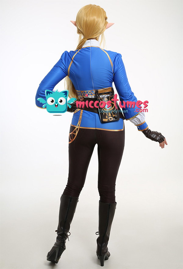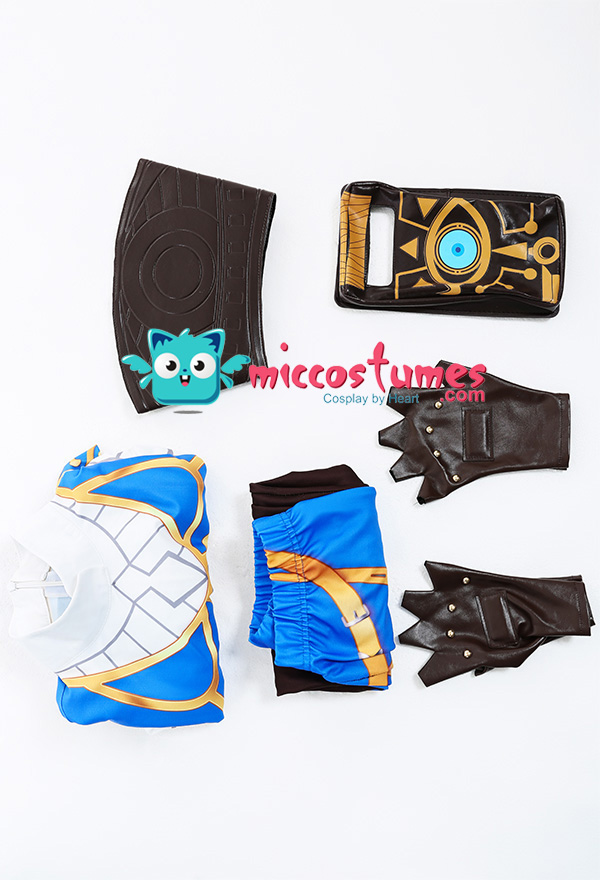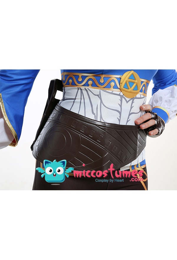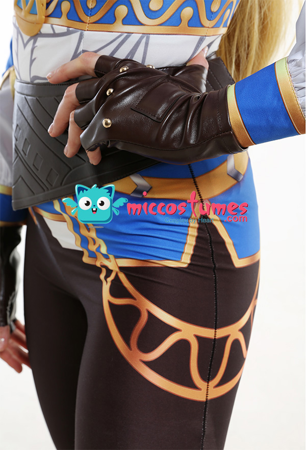 Costume Includes: inner coat, waist belt, pocket, gloves*2, pants. Material: spandex, pu leather, shirt fabric. Design Details: The outfit is digitally printed, only to restore each detail of Princess Zelda. The decoration on the front chest is made of rubber, and the patterns on the pocket adopts a heat-transfer process. The waist belt is embossing.