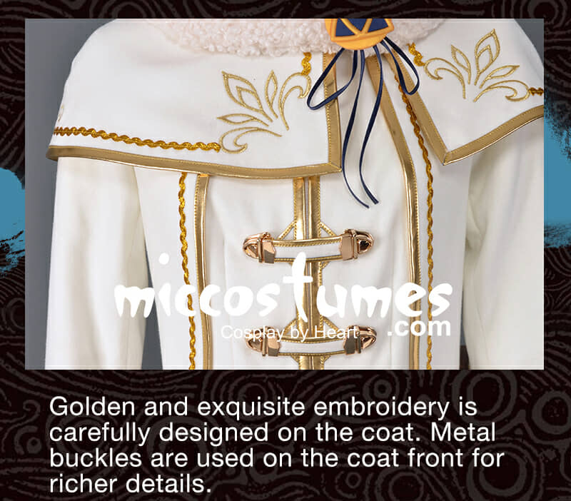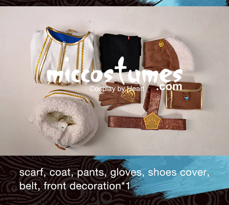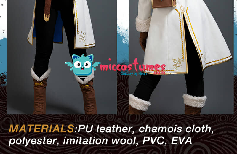 The costume includes scarf, coat, pants, gloves, shoes cover, belt, bag*1, front decoration*1. It is made of PU leather, chamois cloth, polyester, imitation wool, EVA.