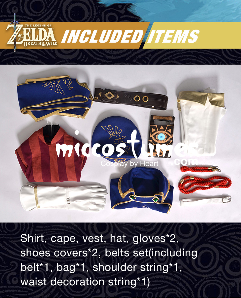 | Included Items | Shirt, cape, vest, hat, gloves*2, shoes covers*2, belts set(including belt*1, bag*1, shoulder string*1, sheikah slate*1 |