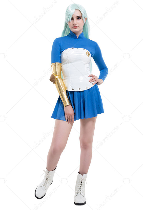 The costume includes top, skirt, chest guard*1, armguard*1, elbow guard*1. It is made of spandex, PU leather.