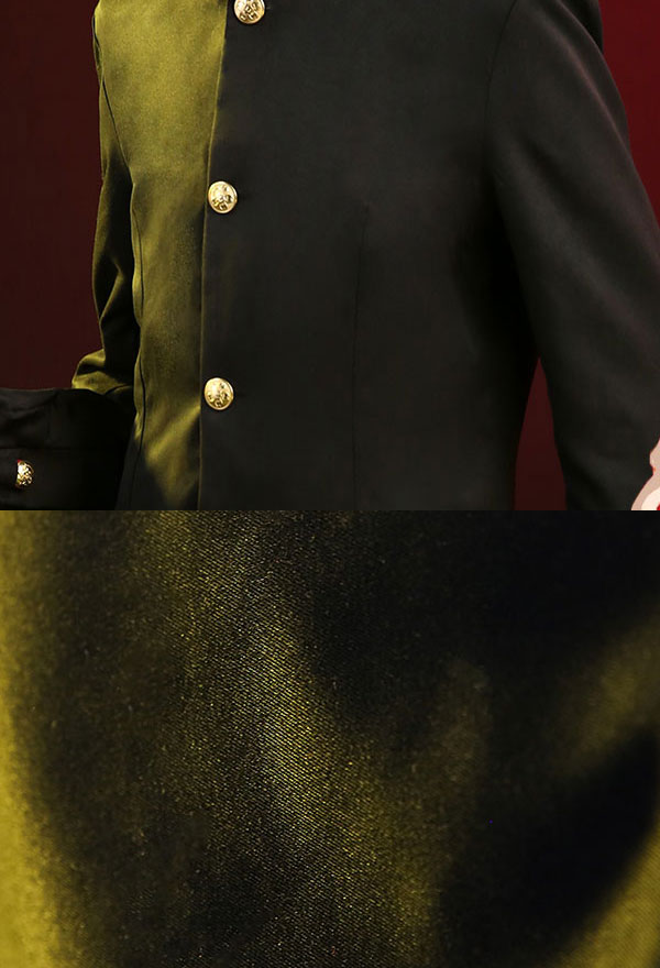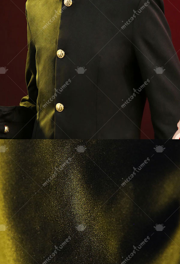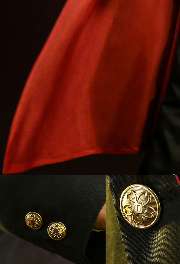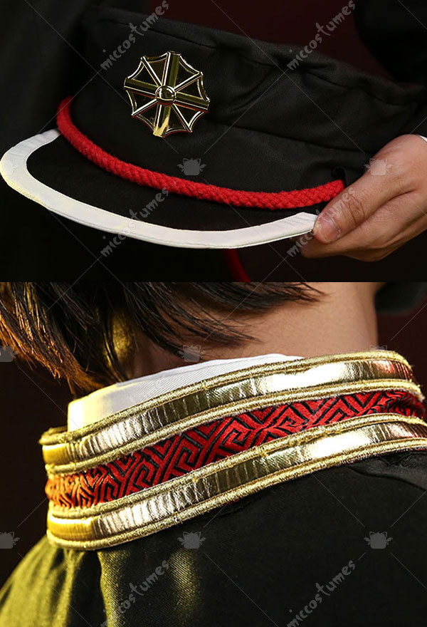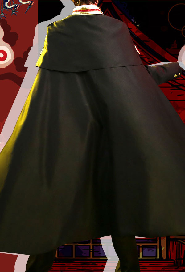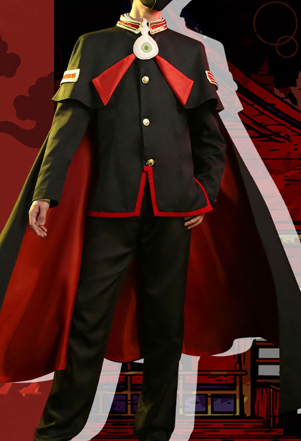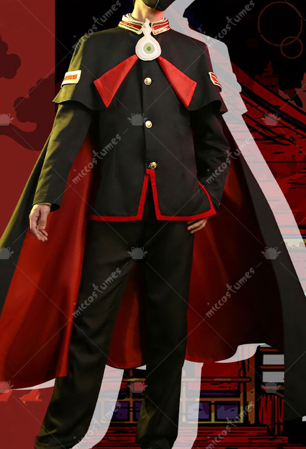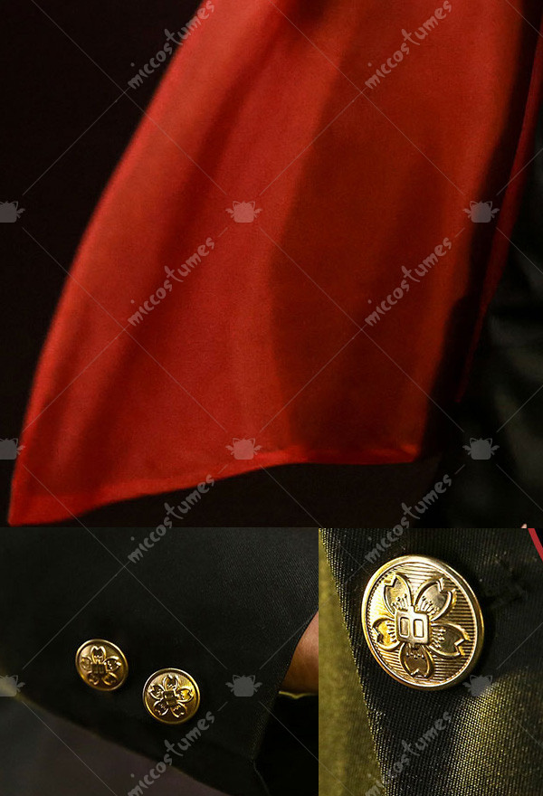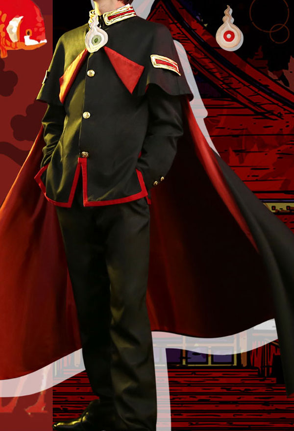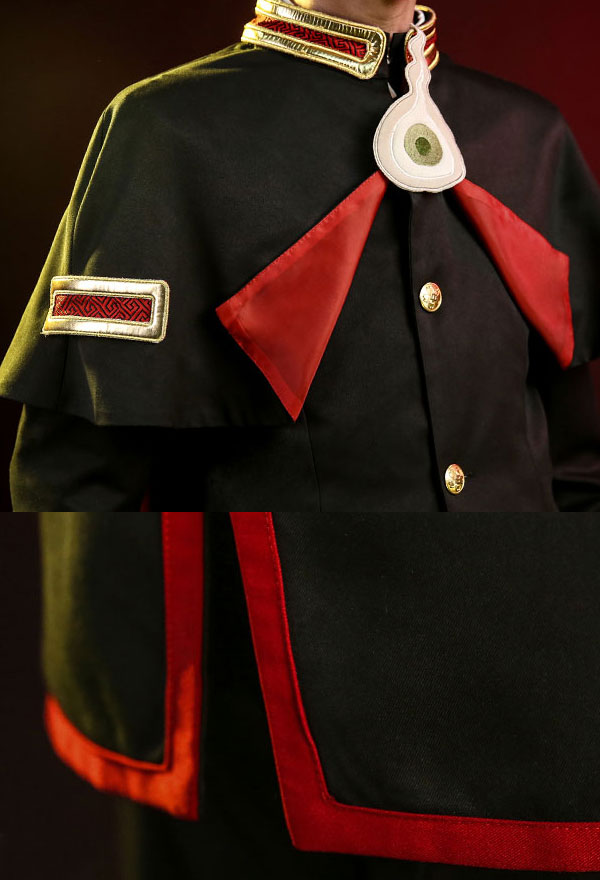 The costume includes uniform coat, shirt, hat, belt, pants, accessory*2, badge*1, tattoo sticker*1. It is made of uniform cloth. The cloak is sold separately.