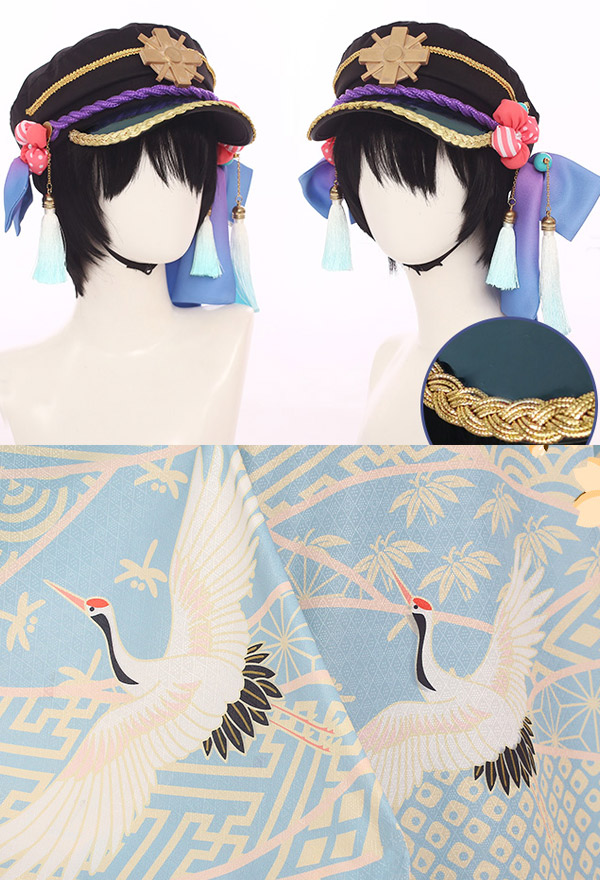 The costume includes haori, card pendant*2, chest string*1, hat, tassels accessory*2, bowknot accessory*1, hair clasp*1, waist bow accessory*1, Hakama, shirt, glove. It is made of printing fabric.
