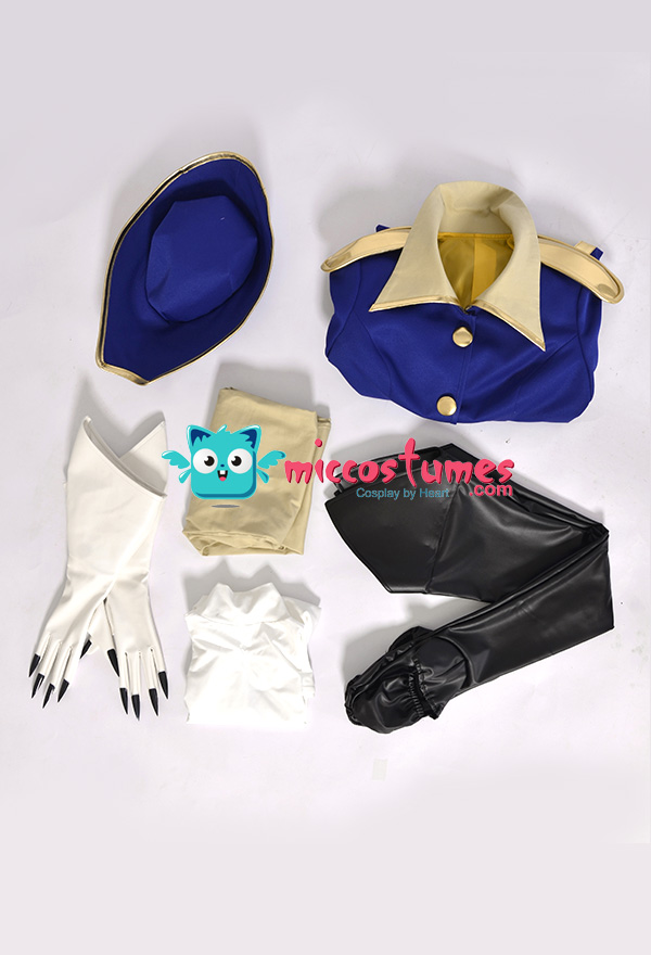 The costume includes coat, base shirt, pants, hat, shoes cover*2, glove*2. It is made of uniform cloth, spandex, PU leather, lining cloth, EVA, Sirospun.
