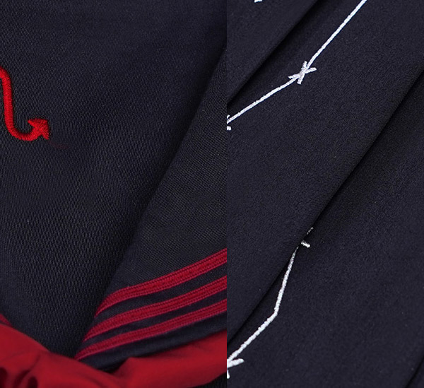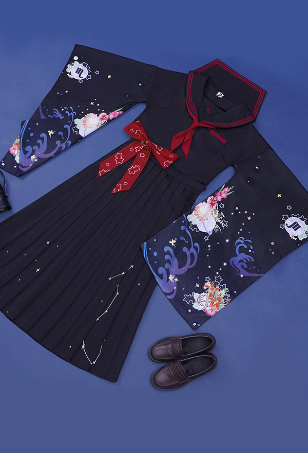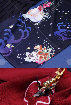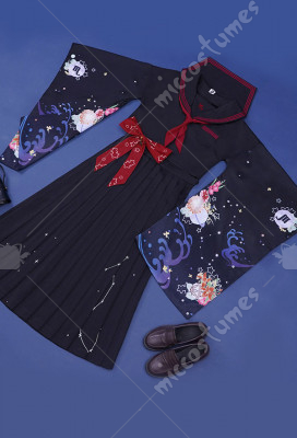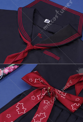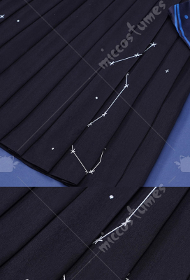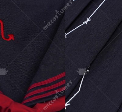 The costume includes bowtie, top, skirt, waist bowknot. It is made of TR suit fabric, uniform fabric, printing fabric.