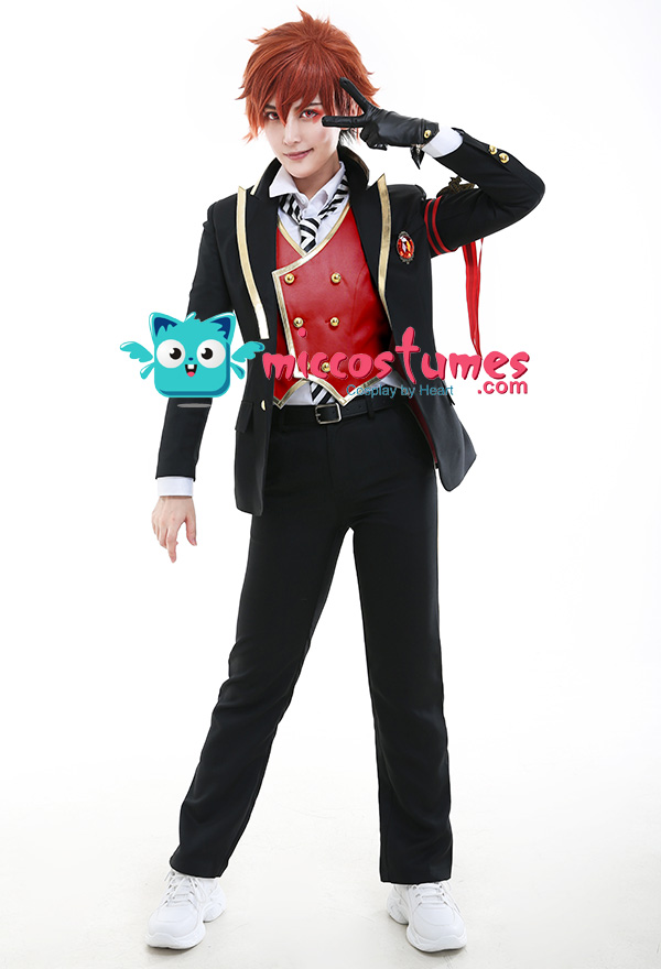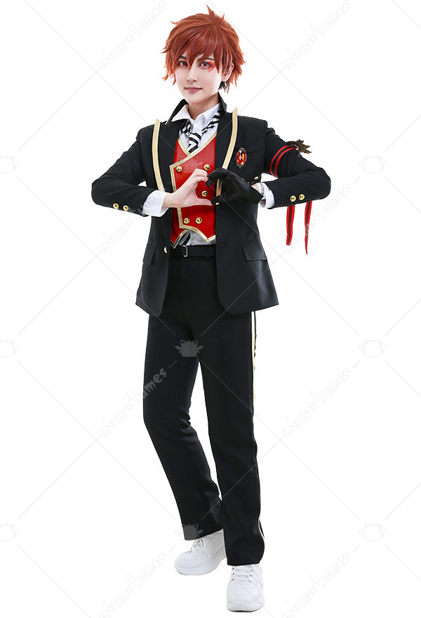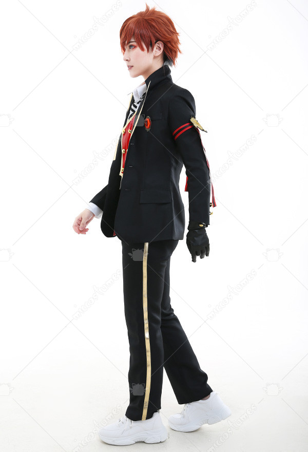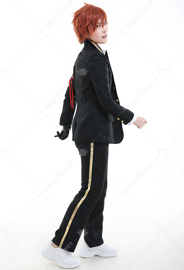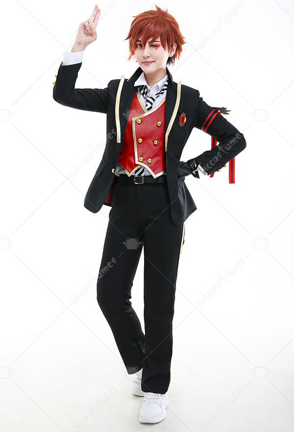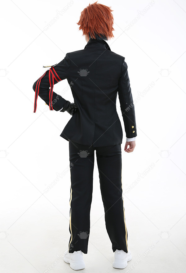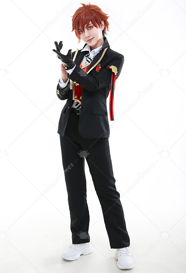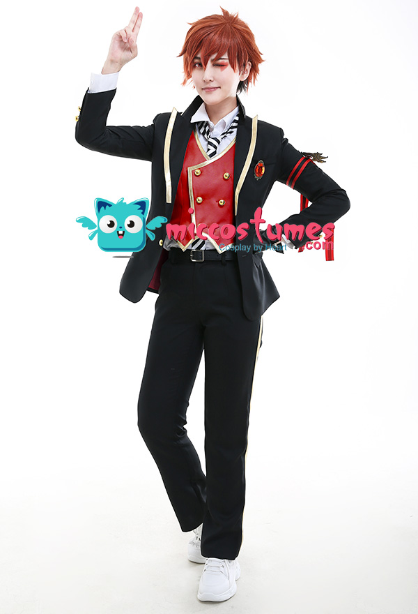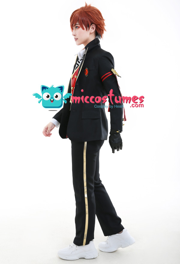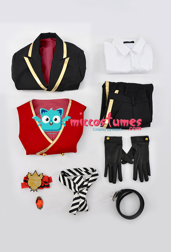 Costume Includes: suit, vest, shirt, pants, tie, glove*2, armband*1, ribbon*1, brooch*1, belt*1. Materials: PU leather, uniform cloth, lining, satin. Design Details: The suit with padded shoulders gives wearers the illusion of having broader and less sloping shoulders. Red of selected lining fabric and the exquisite patterns embroidered on armband are close to character'