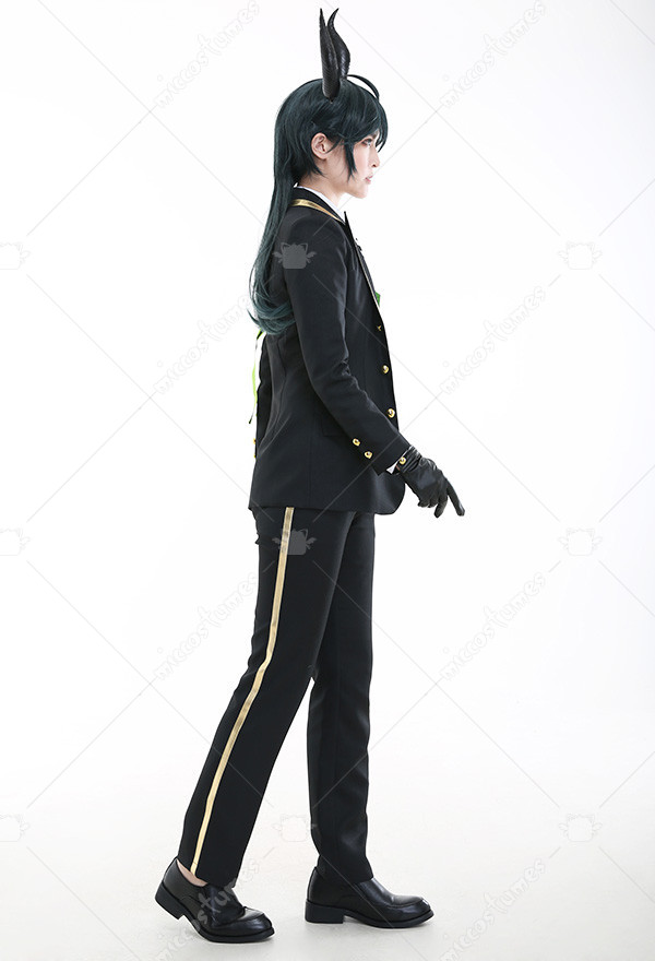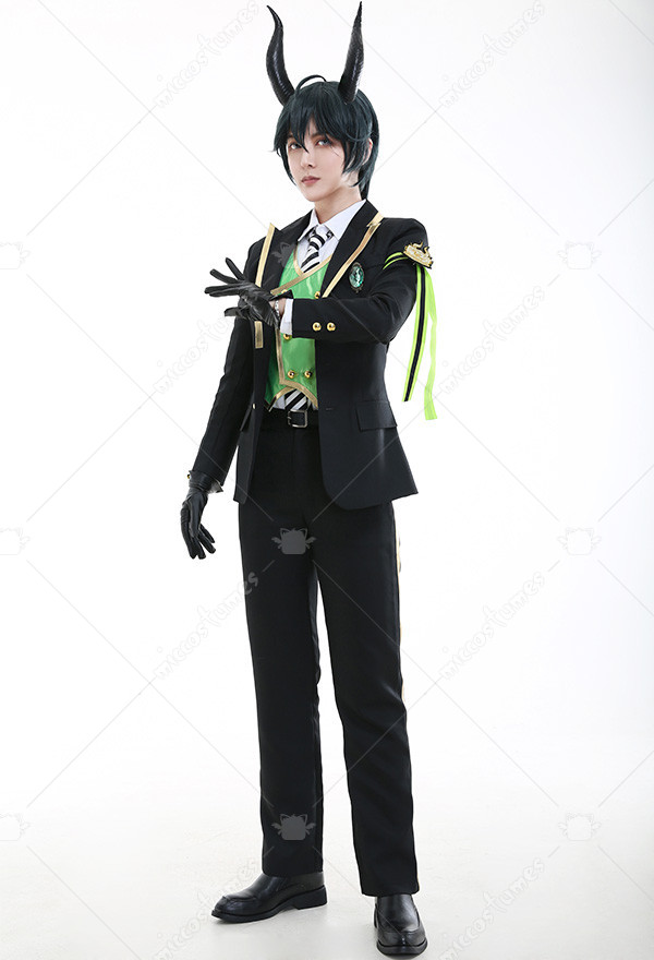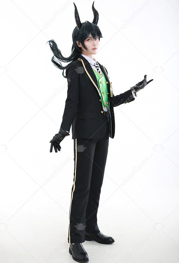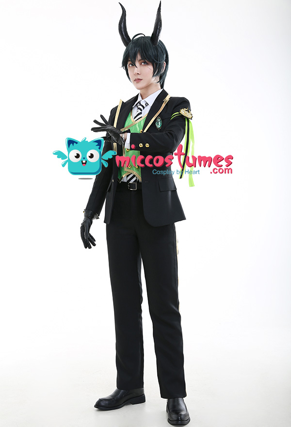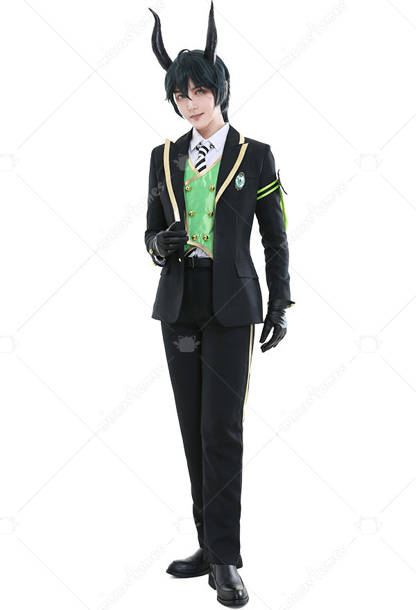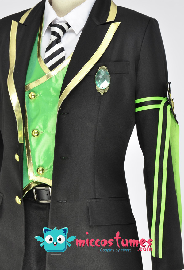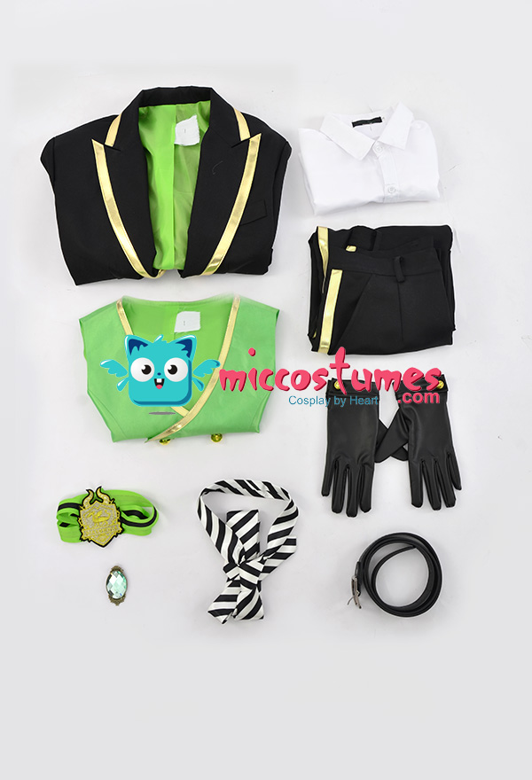 Costume Includes: suit, vest, shirt, pants, tie, glove*2, armband*1, ribbon*1, brooch*1, belt*1. Materials: PU leather, uniform cloth, lining, satin. Design Details: The suit with padded shoulders gives wearers the illusion of having broader and less sloping shoulders. Green of selected lining fabric and the exquisite patterns embroidered on armband are close to character's. The vest is made of quality satin fabric, which is glossy in light.