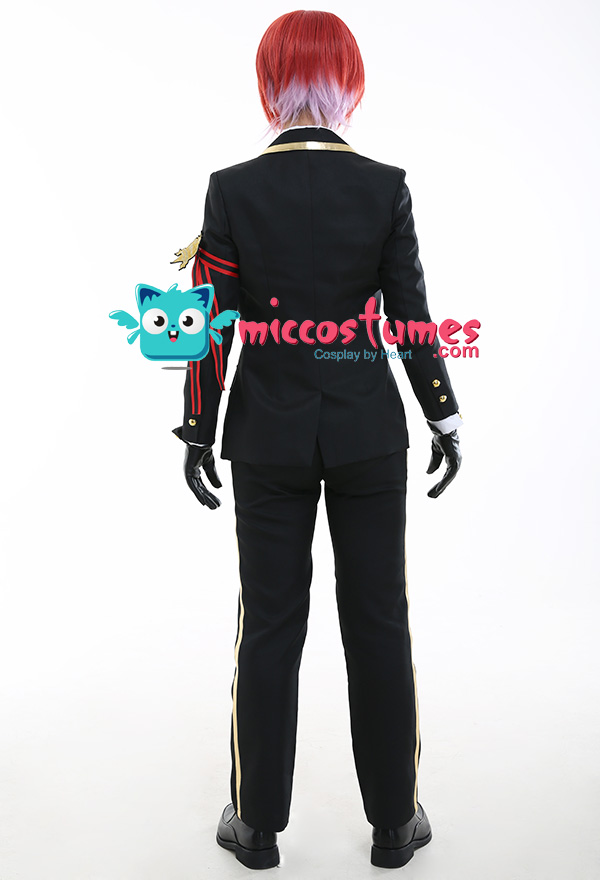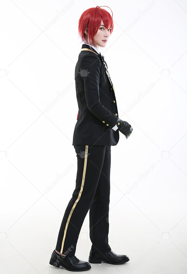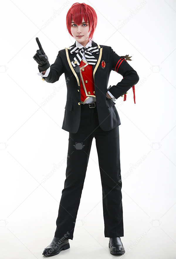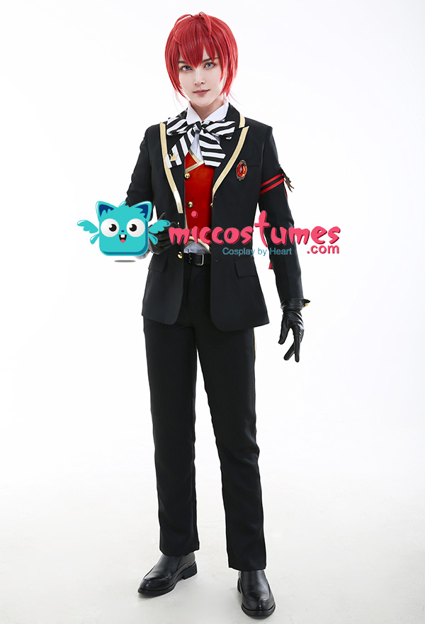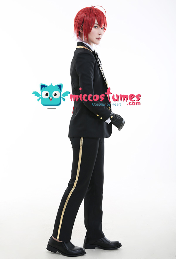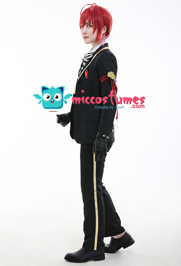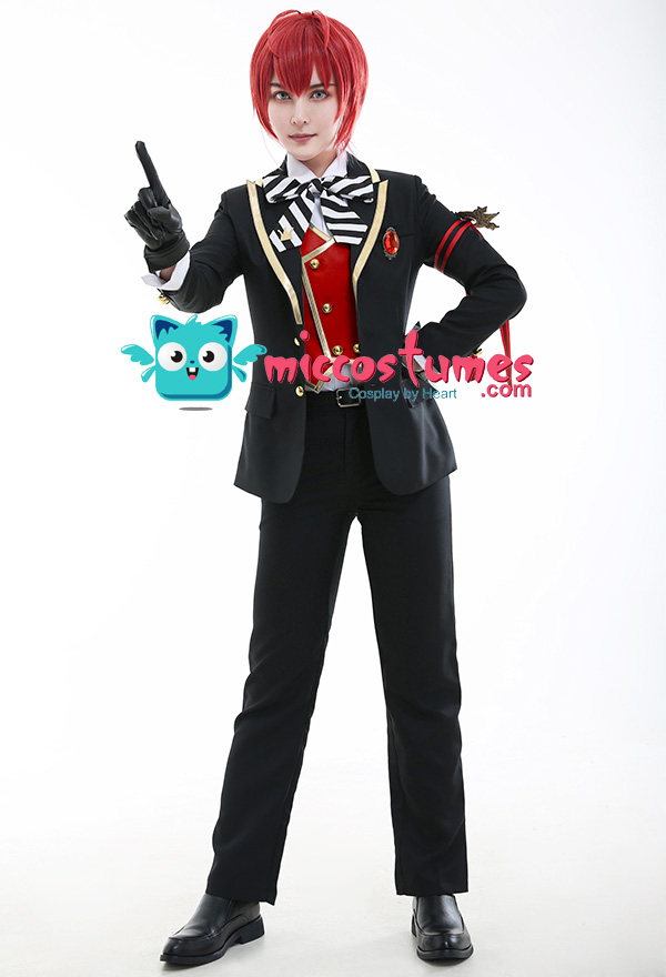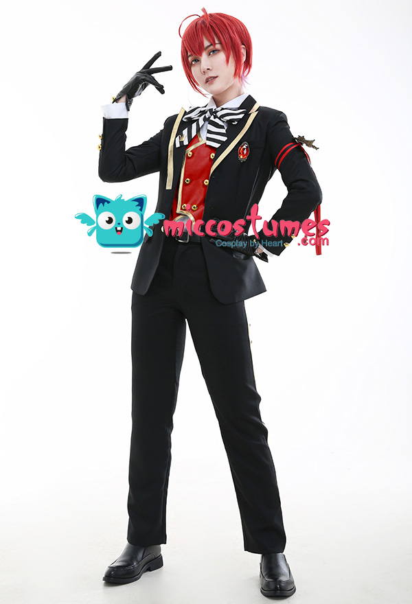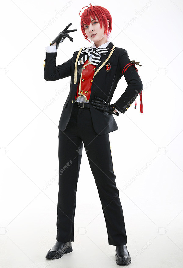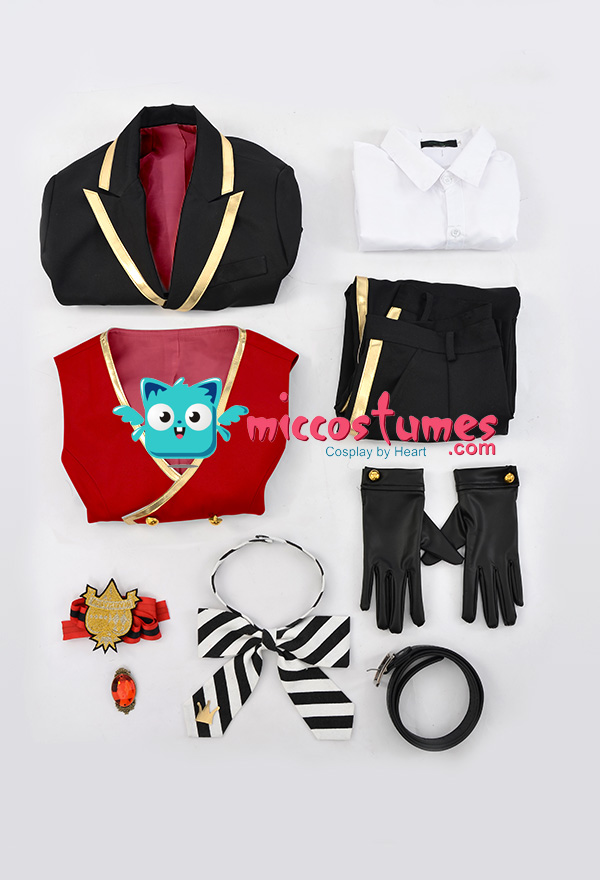 Costume Includes: suit, vest, shirt, pants, bowtie, glove*2, armband*1, ribbon*1, brooch*1, belt*1. Materials: PU leather, uniform cloth, lining, satin. Design Details: The suit with padded shoulders gives wearers the illusion of having broader and less sloping shoulders. Red of selected lining fabric and the exquisite patterns embroidered on armband are close to character's.
