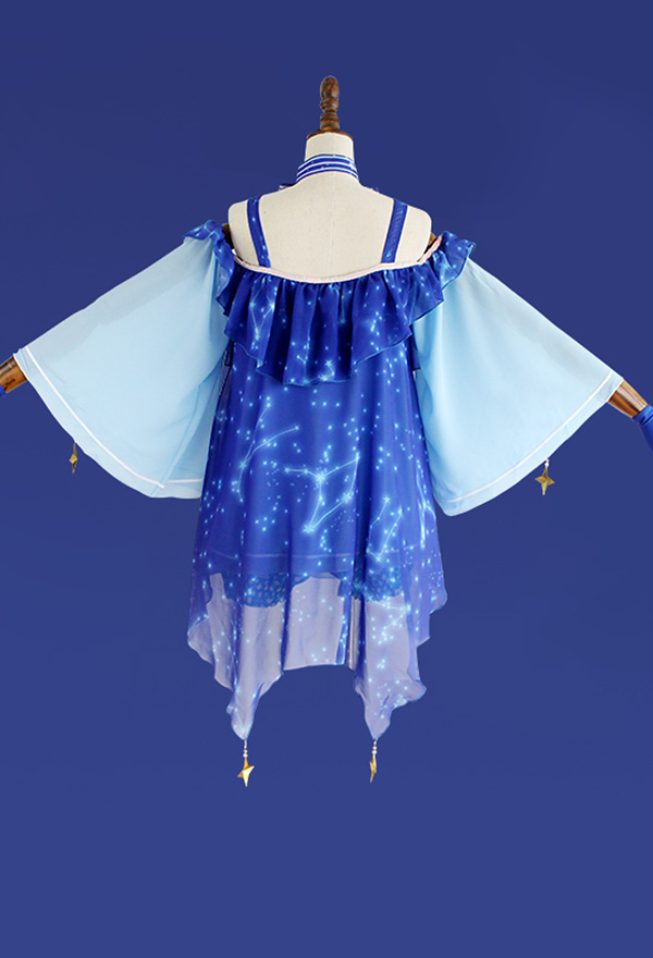 The costume includes upper garment, pants, choker, star headdress, bowknot headdress, glove*2, star pendant, thigh bowknot accessory. It is made of gauze.