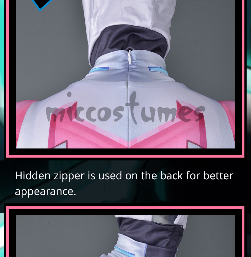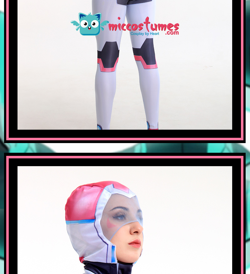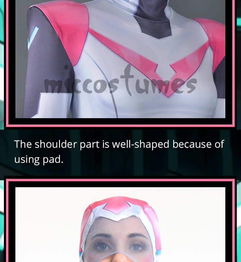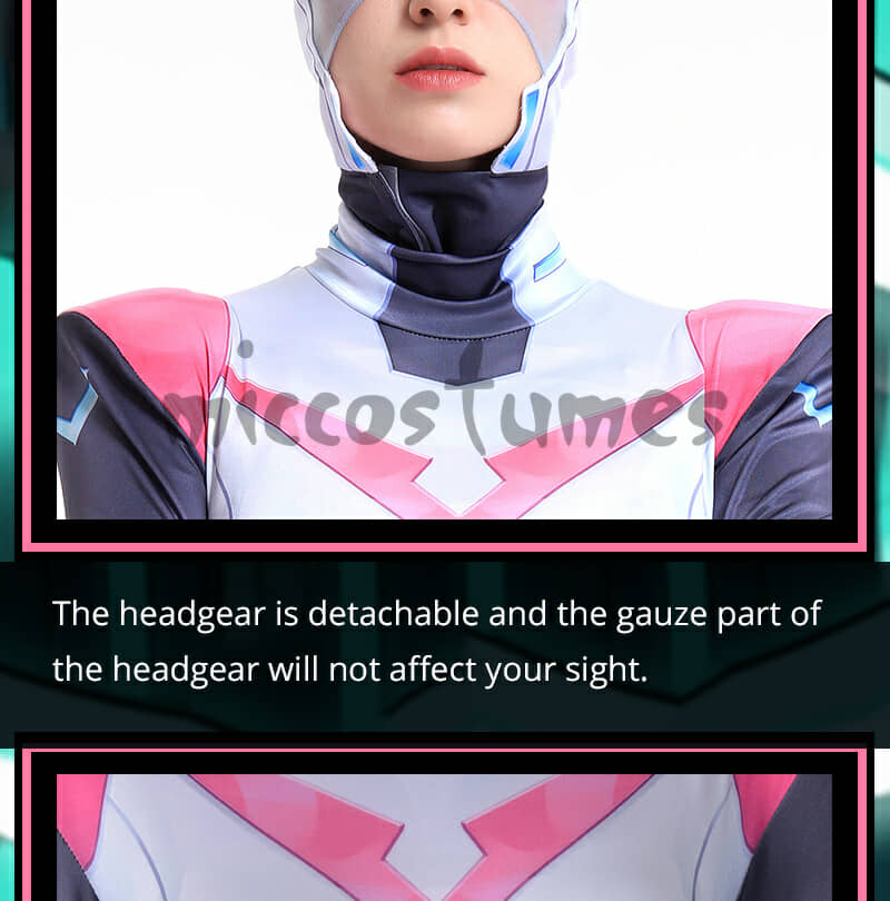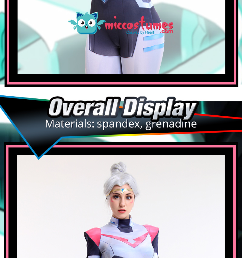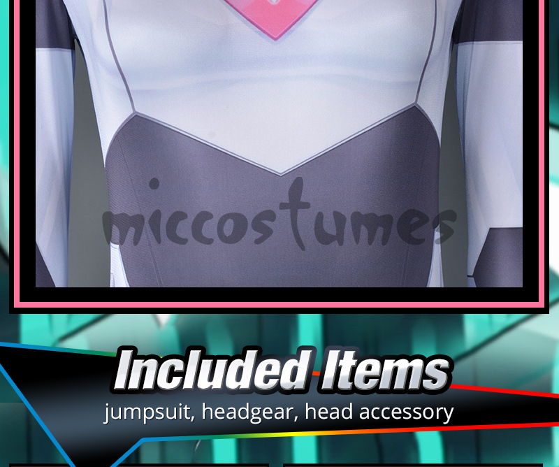 The costume includes jumpsuit, headgear, head accessory. It is made of spandex and grenadine.