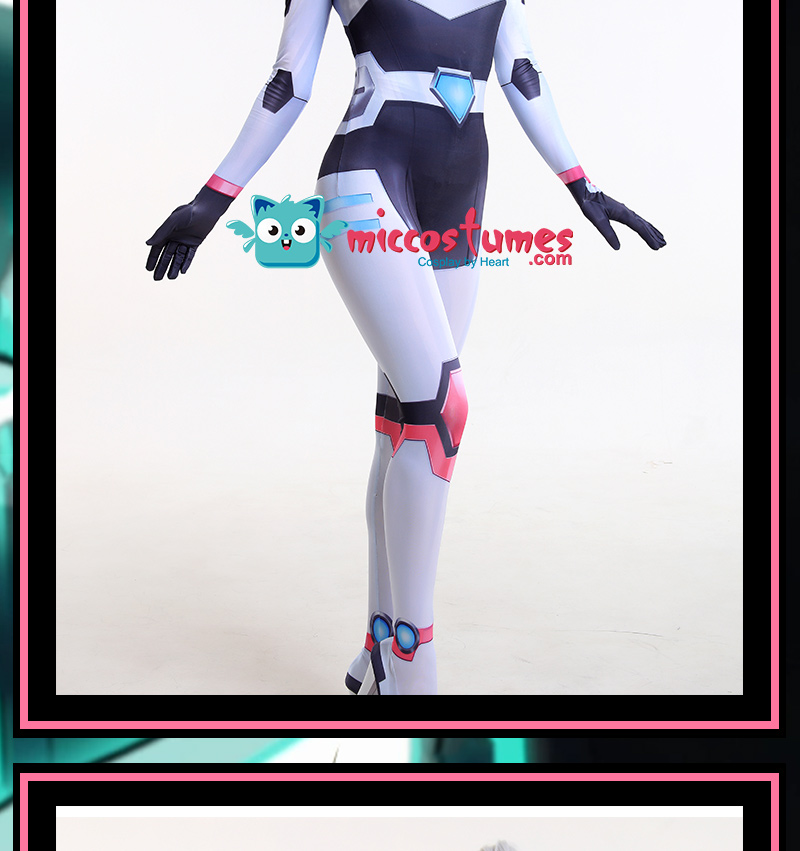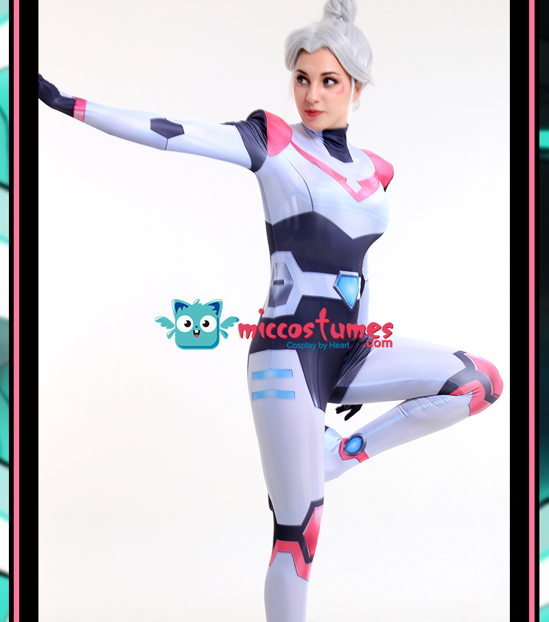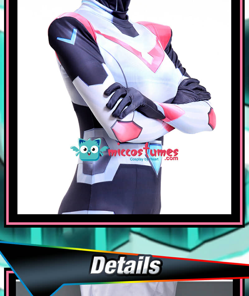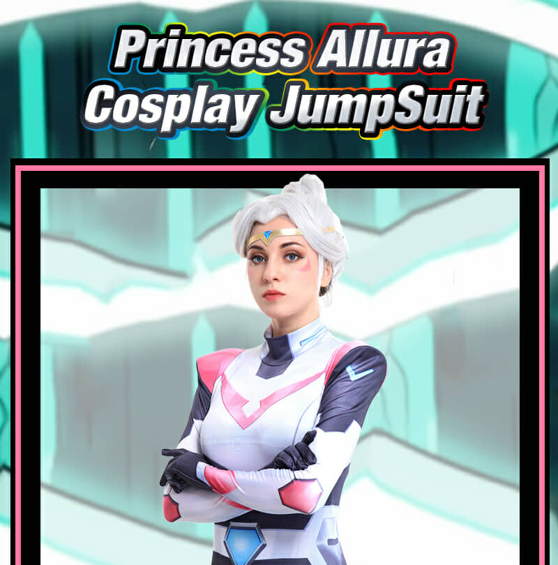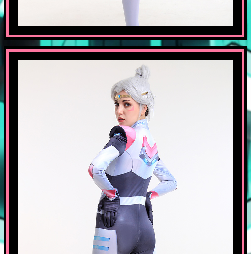 The costume includes jumpsuit, headgear, head accessory. It is made of spandex and grenadine.