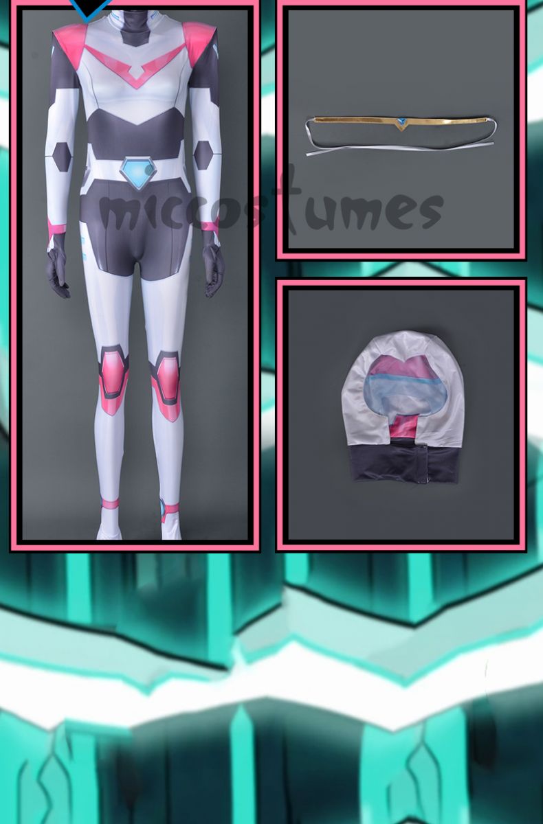 The costume includes jumpsuit, headgear, head accessory. It is made of spandex and grenadine.