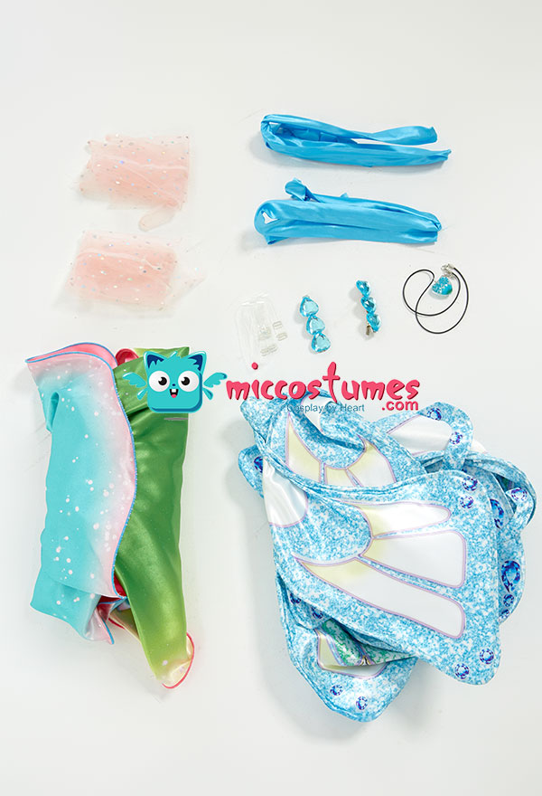 Design Details: The dress is made of digitally printed silver glitter emulation silk. The hem, provided with special design, looks fancy and sophisticated. There is a layer of contrast-color lining in the dress. The wings are made of two-layered printed fabric and provided with aluminum wire and iron wire to offer a better look. Plus, it comes with complete accessories such as necklace, hair accessories, gloves and ankle accessories.