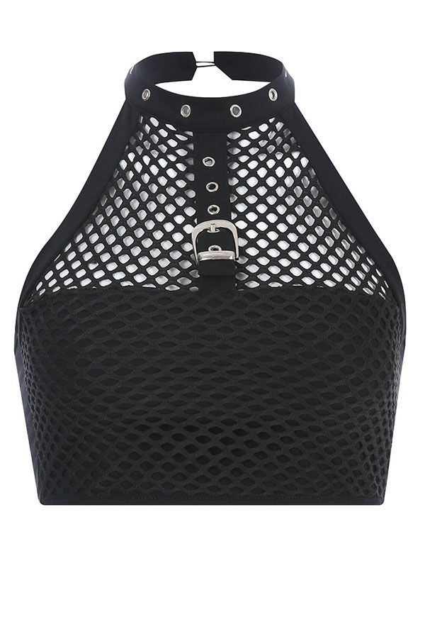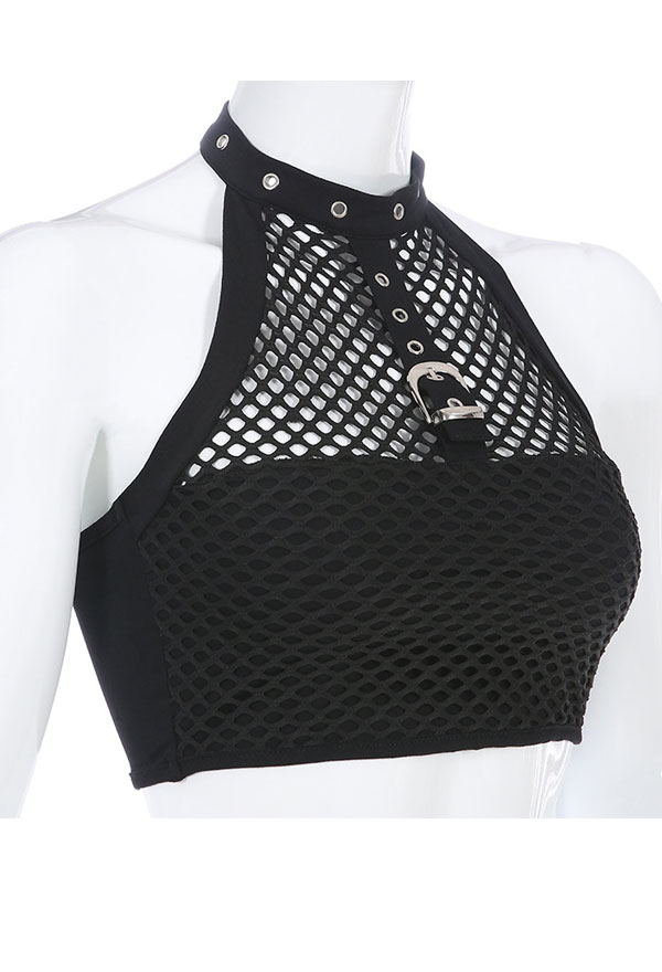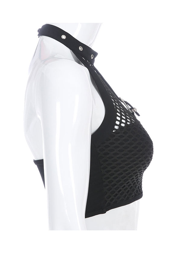 Woman Gothic Cool Dark Style Grid Pattern Belt Deccorated Spliced Button Worn Vest T-Shirt Top Costume Outfit