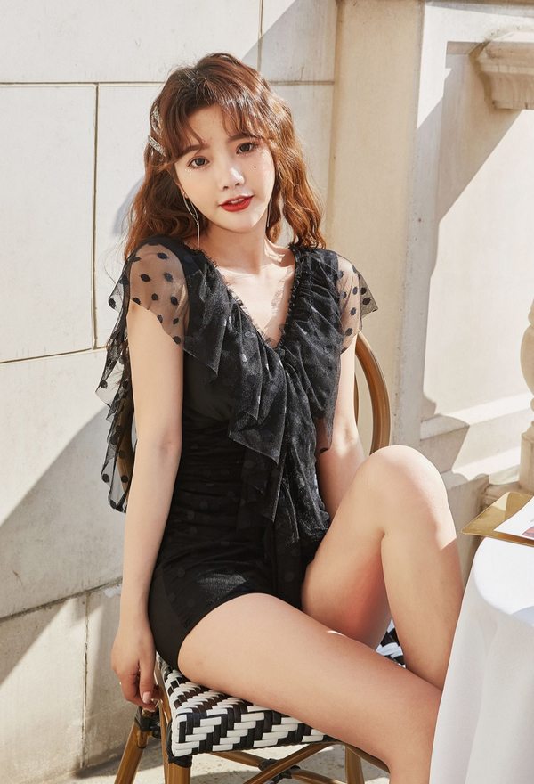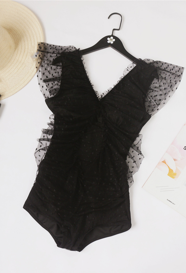 Woman Sexy Cute One Piece Deep V Shape Collar Short Sleeved Backless Lace-Decorated Dress Swimsuit Swimwear Bodysuit Beach Suit Bathing Suit