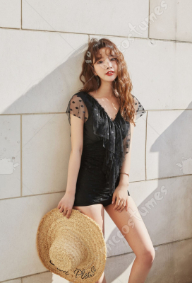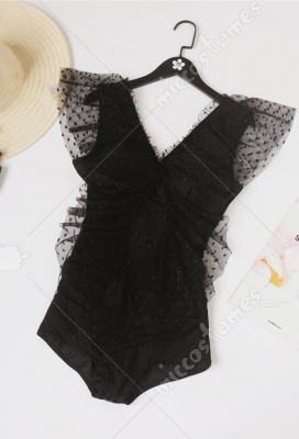 Woman Sexy Cute One Piece Deep V Shape Collar Short Sleeved Backless Lace-Decorated Dress Swimsuit Swimwear Bodysuit Beach Suit Bathing Suit