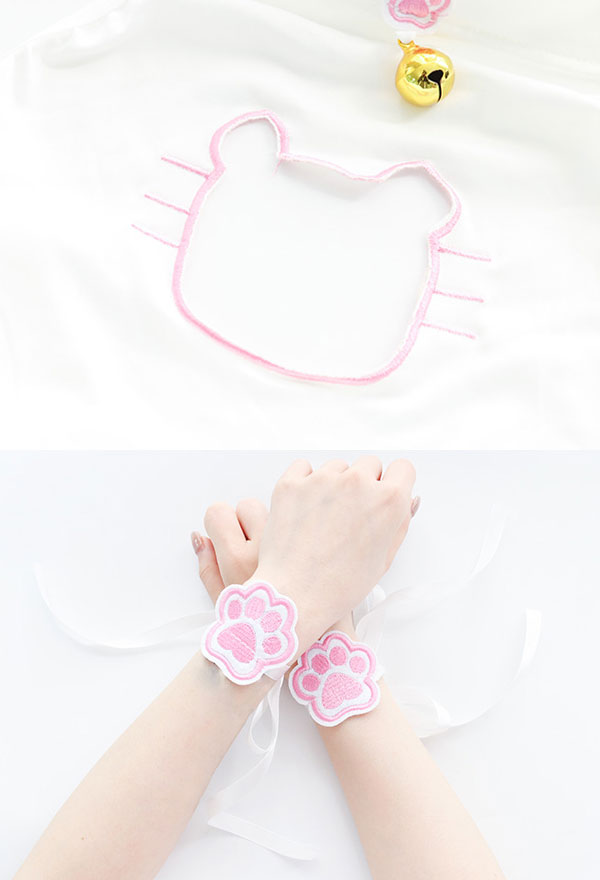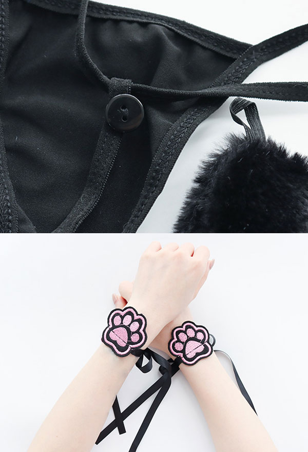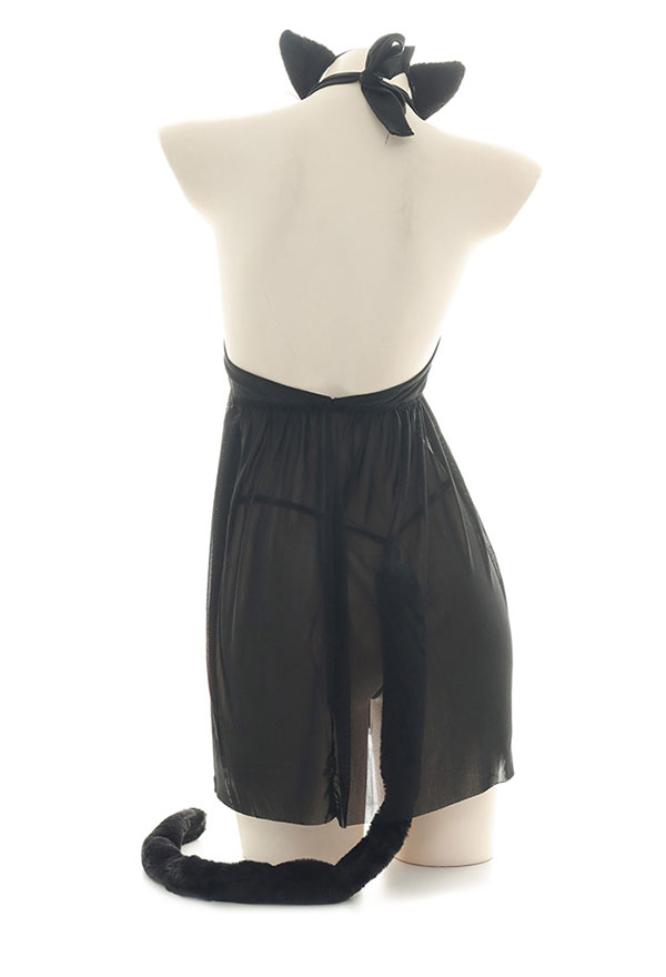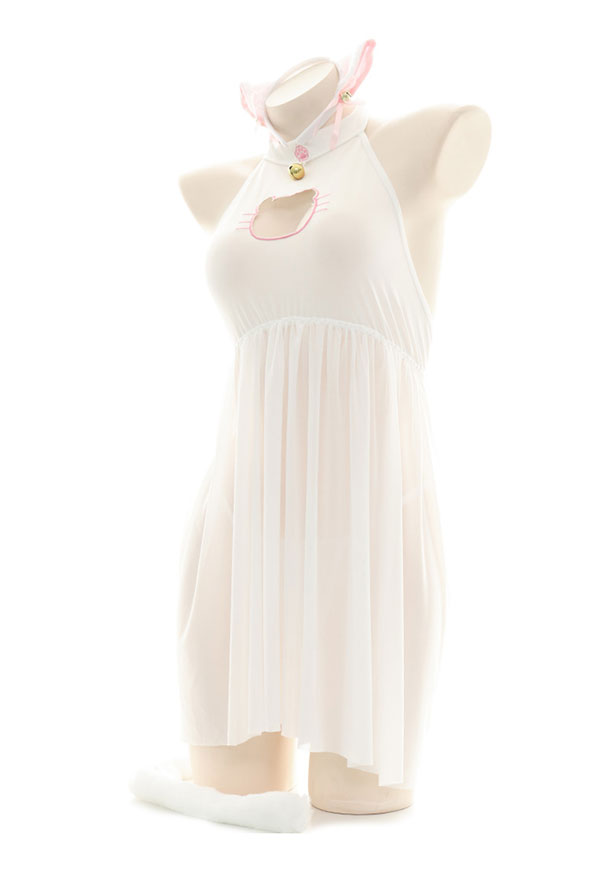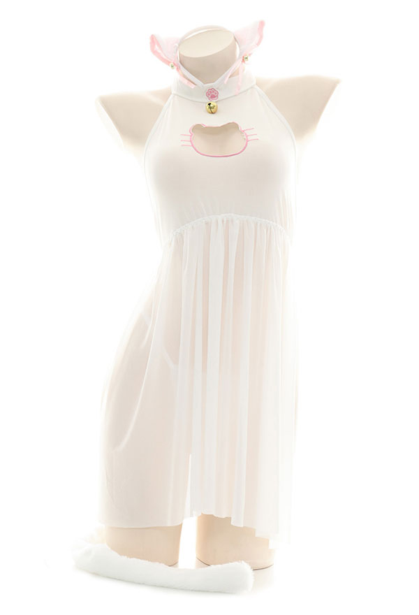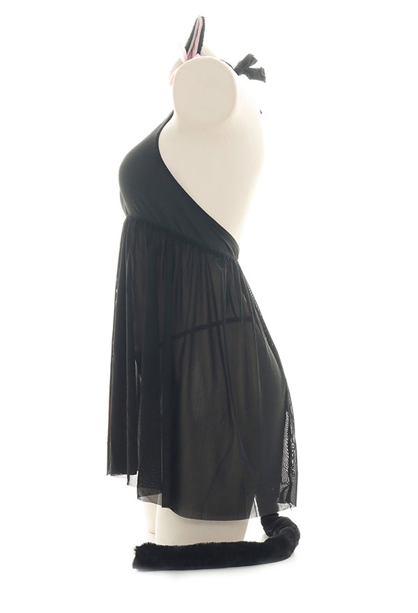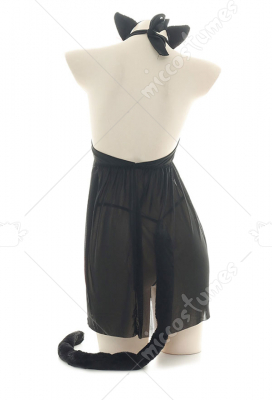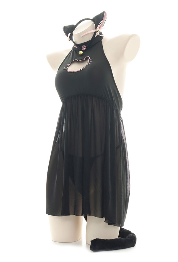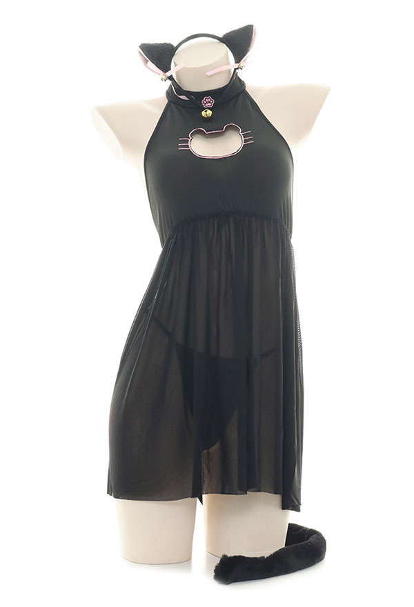Costume Includes: dress, hairband, thong, tail, wristband. Material: chiffon, polyester. Design Details: The collar is designed as a paw pattern halter form, decorated with bells, which looks very cute! The cat head chest-open pattern looks very cute. The hem is made of net yarn, which seems fascinated.