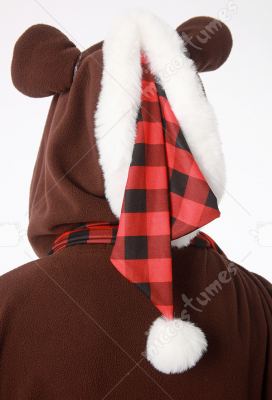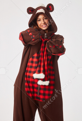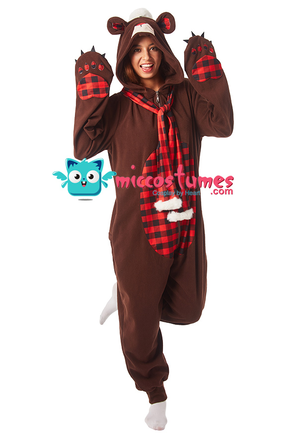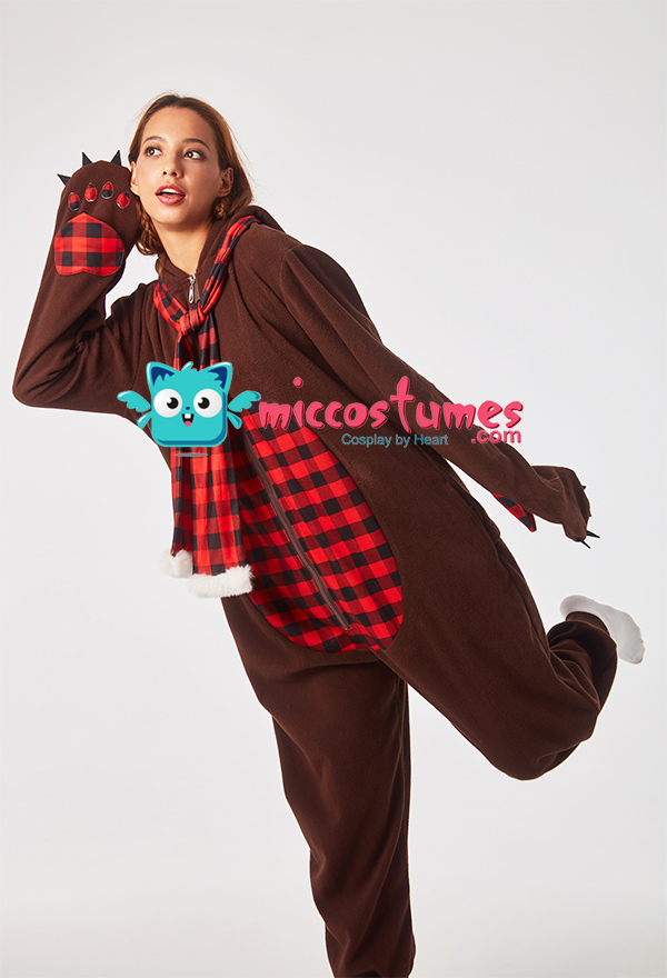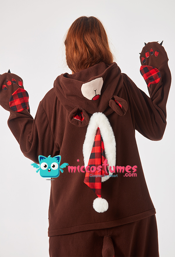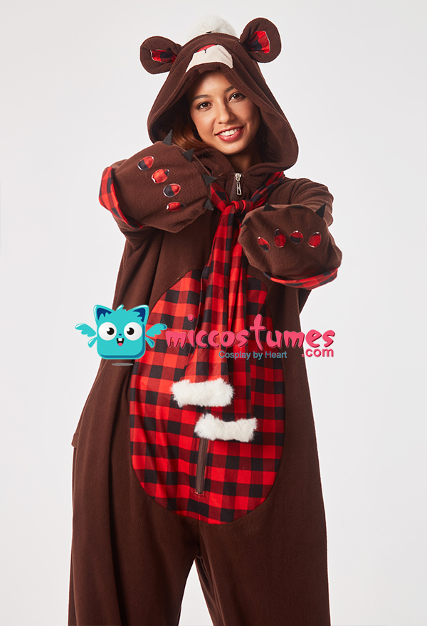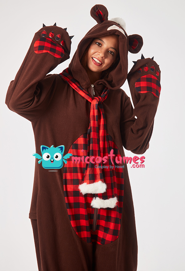 Women Christmas Onesie Teddy Bear Adult Onesie Red and Black Plaid Onesie Pajama Long Sleeve Hooded Kigurumi Costume