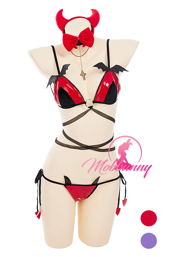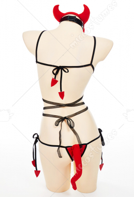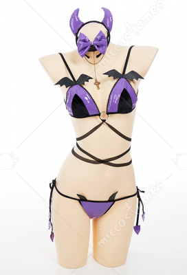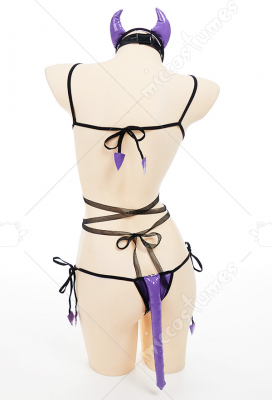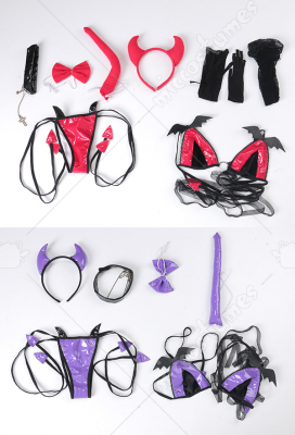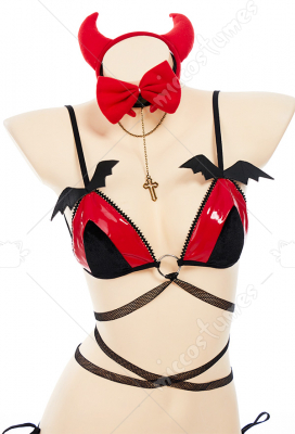 Costume Includes: necklace,top,briefs,stockings,gloves,headwear,bow choker,tail. Material: PU leather. Design Detail: Lingerie set was decorated with bat, necklace can be worn with a velcro,the rope part on the front chest can be self-designed.