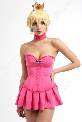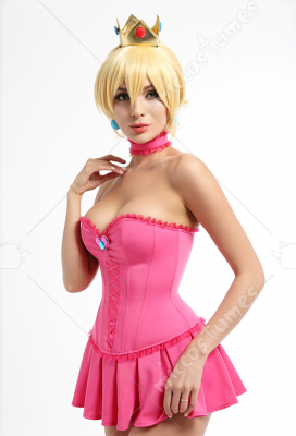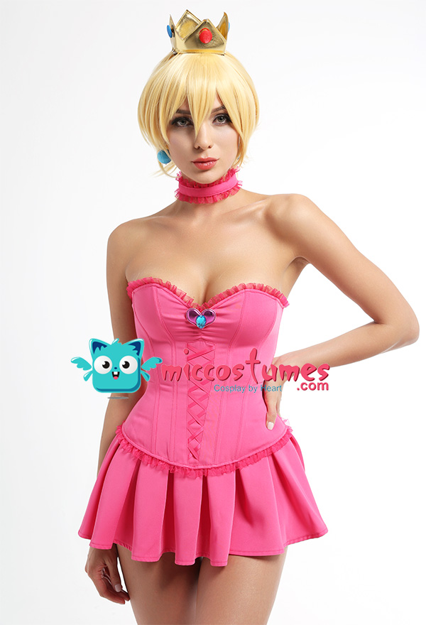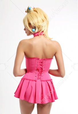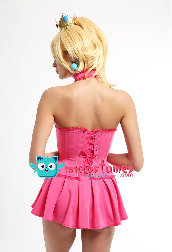Costume Includes: corset, skirt, choker, chest adornment. Material: wool, terry fabric, plastic bones. Design Details: Princess Peach design corset, back strap is adjustable, this can be matched with half skirt or worn alone.