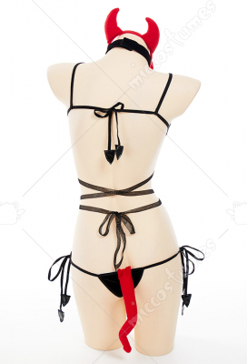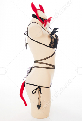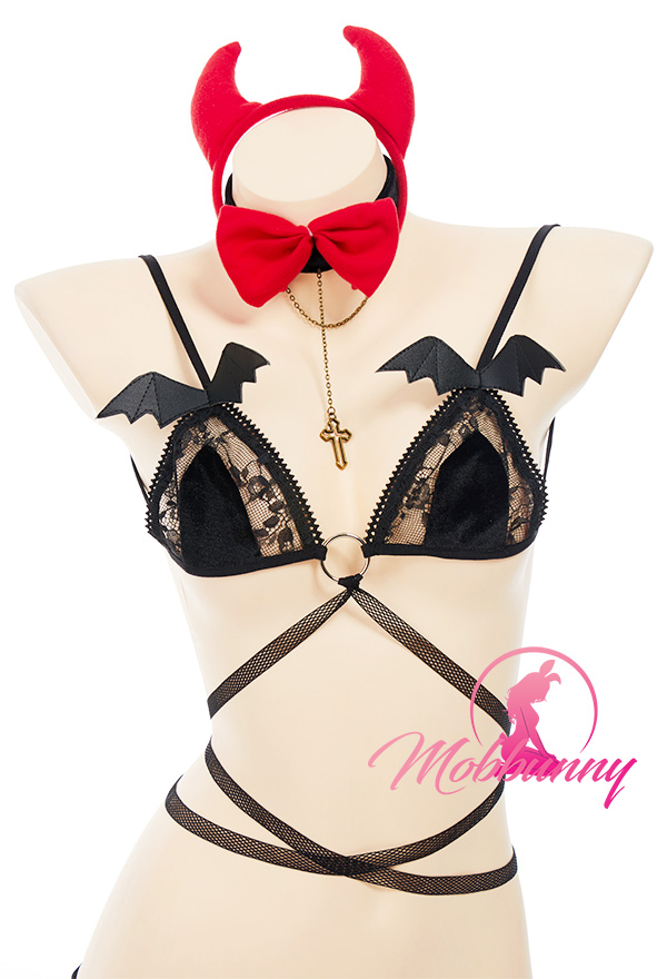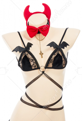 Costume Includes: top, thong, headband, bow tie, necklace, tail, stockings, gloves. Material:pu leather, suede, lace. Design Detail: lingerie set was decorated with bat, necklace can be worn with a velcro,the rope part on the front chest can be self-designed.
