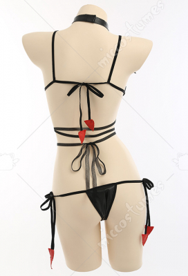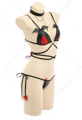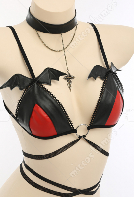 Costume Includes: top, thong, headband, bow tie, necklace, tail, stockings, gloves. Material:pu leather. Design Detail: lingerie set was decorated with bat, necklace can be worn with a velcro,the rope part on the front chest can be self-designed.