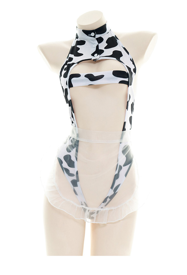 • Costume Includes: cow printed one-piece bodysuit, apron.