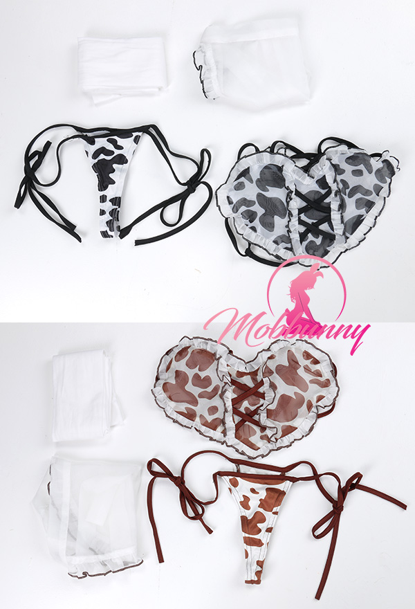 Costume Includes: top,briefs,apron,stockings. Material: chiffon,micro fiber,organza. Design Details:The front middle part is decorated with digital milk cow printing, heart-shaped translucent top. There are three styles available.